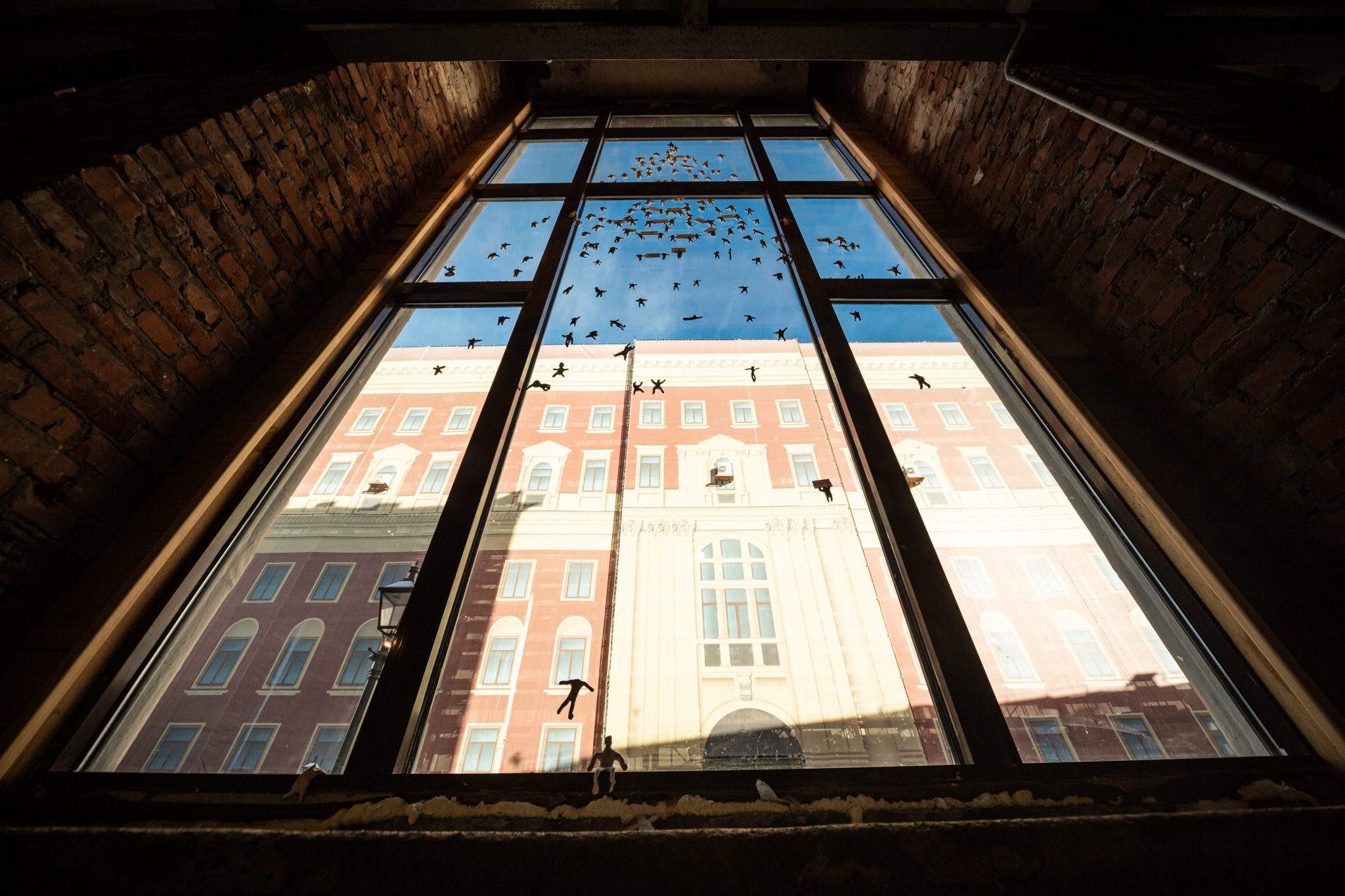 Например, арт-группировка "ЗИП" представила свою работа, позволяющую каждому зрителю стать соавтором художников. Десятки маленьких белых человечков из пластилина висят на окнах пространства, как бы выглядывая в город.