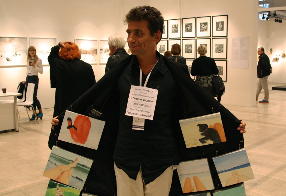 Нет, не случайным. Вот ни в коем случае не случайным, то есть я не хожу так по городу, я не хожу так в метро. Исключительно на каких-то крупных событиях. В девяносто шестом году появилась как раз (очень удачно совпало) первая ярмарка — «Арт-Москва» называлась. Ну вот сейчас наследник — это Cosmoscow . Галерея пальто уже существовала и там получила развитие свое. А вообще, цель, ну как в галерее — показать художника, но, опять же, не случайным людям, а зрителю, который пришел на какое-то мероприятие, который хочет что-то узнать. Вот показать художника и продать, конечно.