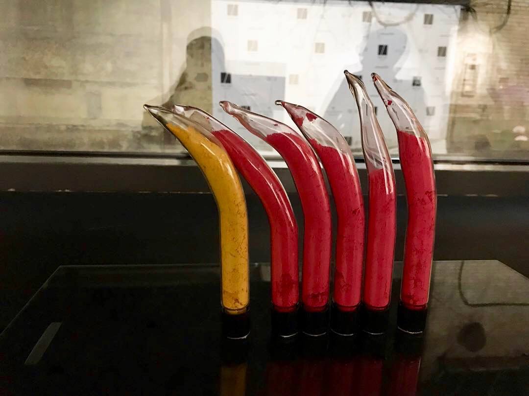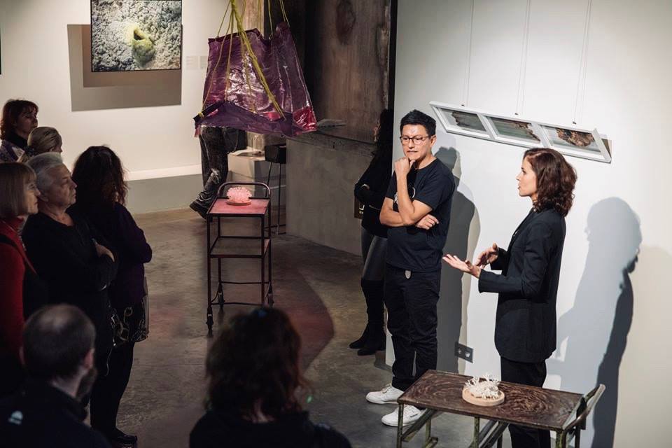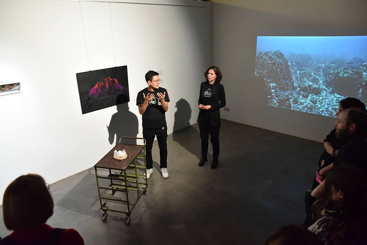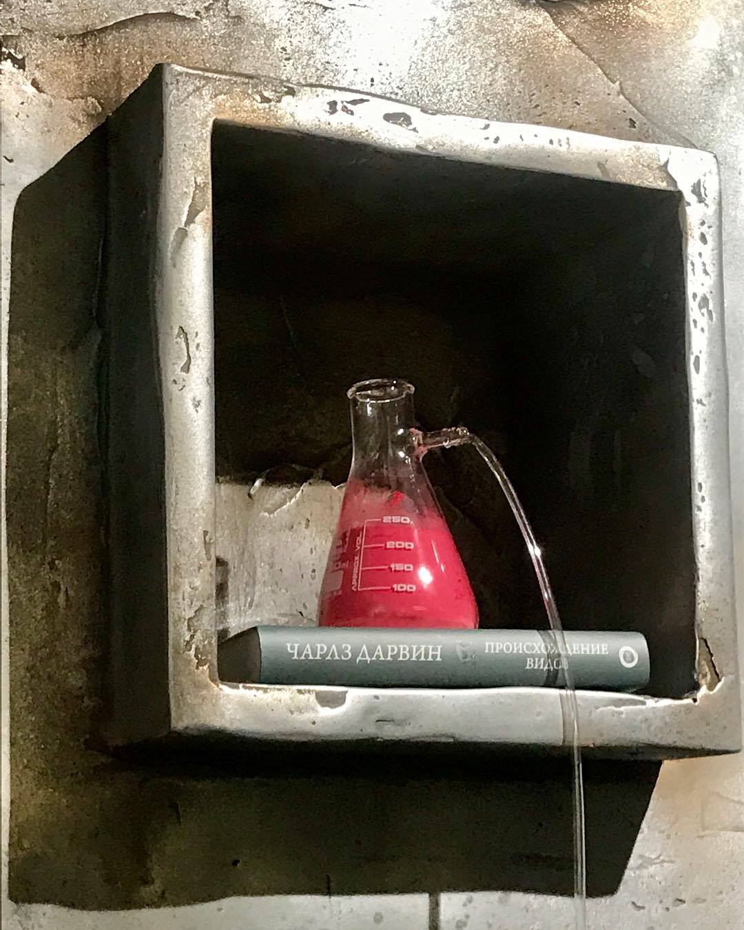Загадочно, как в тайной химической лаборатории, Paul Rosero расставляет в пространстве галереи хрупкие и эстетичные колбочки с органическими пигментами, собранными как под, так и над водой. Цветовая палитра, на которой держатся все экспозиционные акценты, замыкается на розовом и жёлтом. Такой подход видится в том, что художник ищет корреляцию между цветом, микроорганизмами и полноценными макро-существами, эндемиками, населяющими труднодоступные места Галапагос.