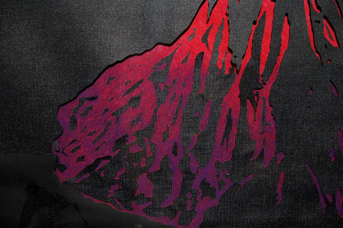 Тем не менее, тот пурпурный, который мы знаем сегодня, существует как результат случайной химической реакции, когда британский химик Уильям Перкин проводил опыты, пытаясь синтезировать лекарство от малярии. Оставшееся в пробирке вещество потрясающего пурпурного цвета сделало Перкина самым могущественным предпринимателем на рынке красителей. Таким образом, багряно–фиолетовые очертания вулкана, явленные лазерной резкой и окроплённые измельчёнными кораллами, представляют итог художественного осмысления хроники взаимоотношений силы и цвета.