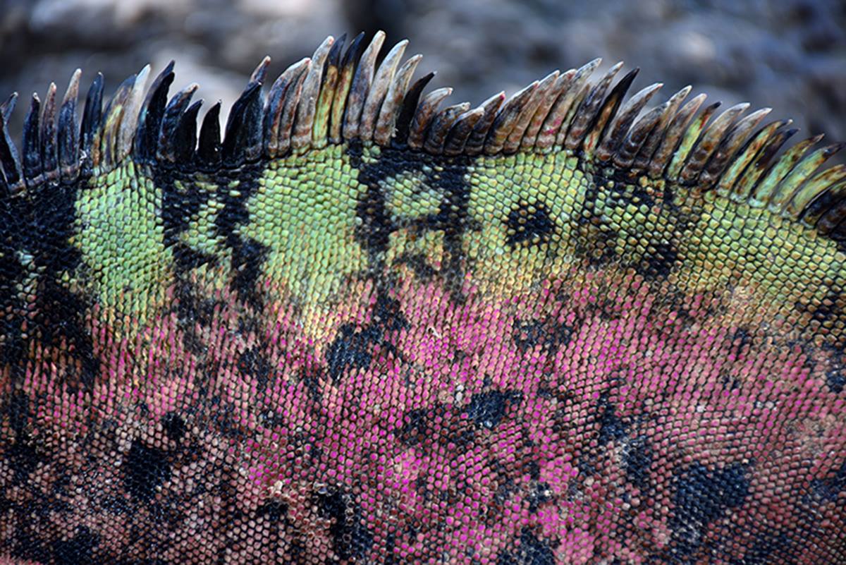 THE SKIN OF ILLUSION — фрагмент шипованного гребня с зелено–розовым градиентом, разрушает все иллюзии. Розовая игуана существует. И обитает она только в северном склоне кратера вулкана WOLF на острове Изабелла Галапагосского архипелага. Этот уникальный вид отделился от остальных, в частности морских, игуан 5,7 млн лет назад, что делает её самым древним биологическим видом на архипелаге, однако обнаруженным только в 1986 году.