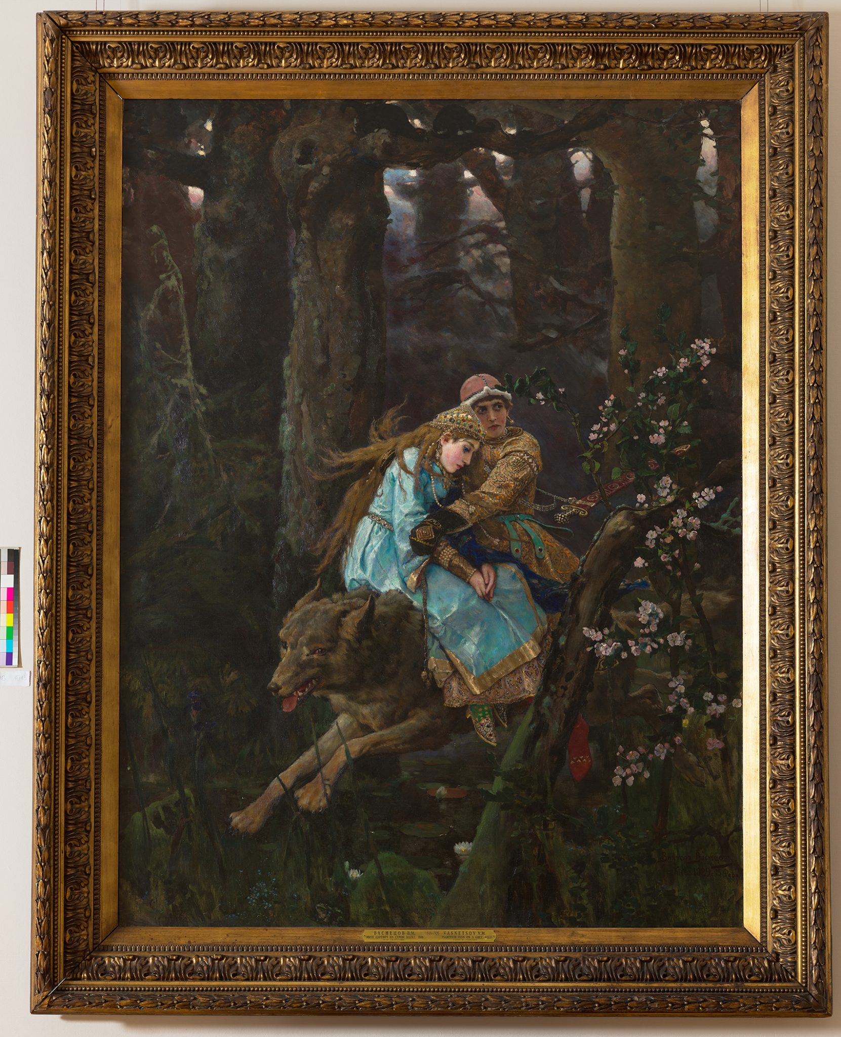 Другая же причина работает на воображение. Если начать с подводного царства, а закончить лесом, символически получается проход через тьму к свету. Как будто, пообщавшись со всей магической нечистью, вы выходите на освещенную солнцем полянку с добрым, хотя и спящим, мишкой. Здесь же располагается один из самых знаковых живописных шедевров – картина Виктора Васнецова «Иван Царевич на Сером Волке». Для меня она один из якорьков в детство. Помню, такая висела около печки в моем деревенском доме.