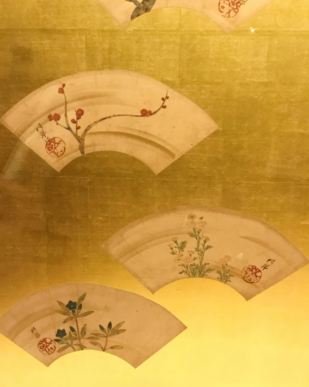Парные шестистворчатые ширмы Татэбаяси Кагэя с изображением на золотом фоне раскрытых вееров представляют типичное произведение школы Римпа с лаконичными мотивами.