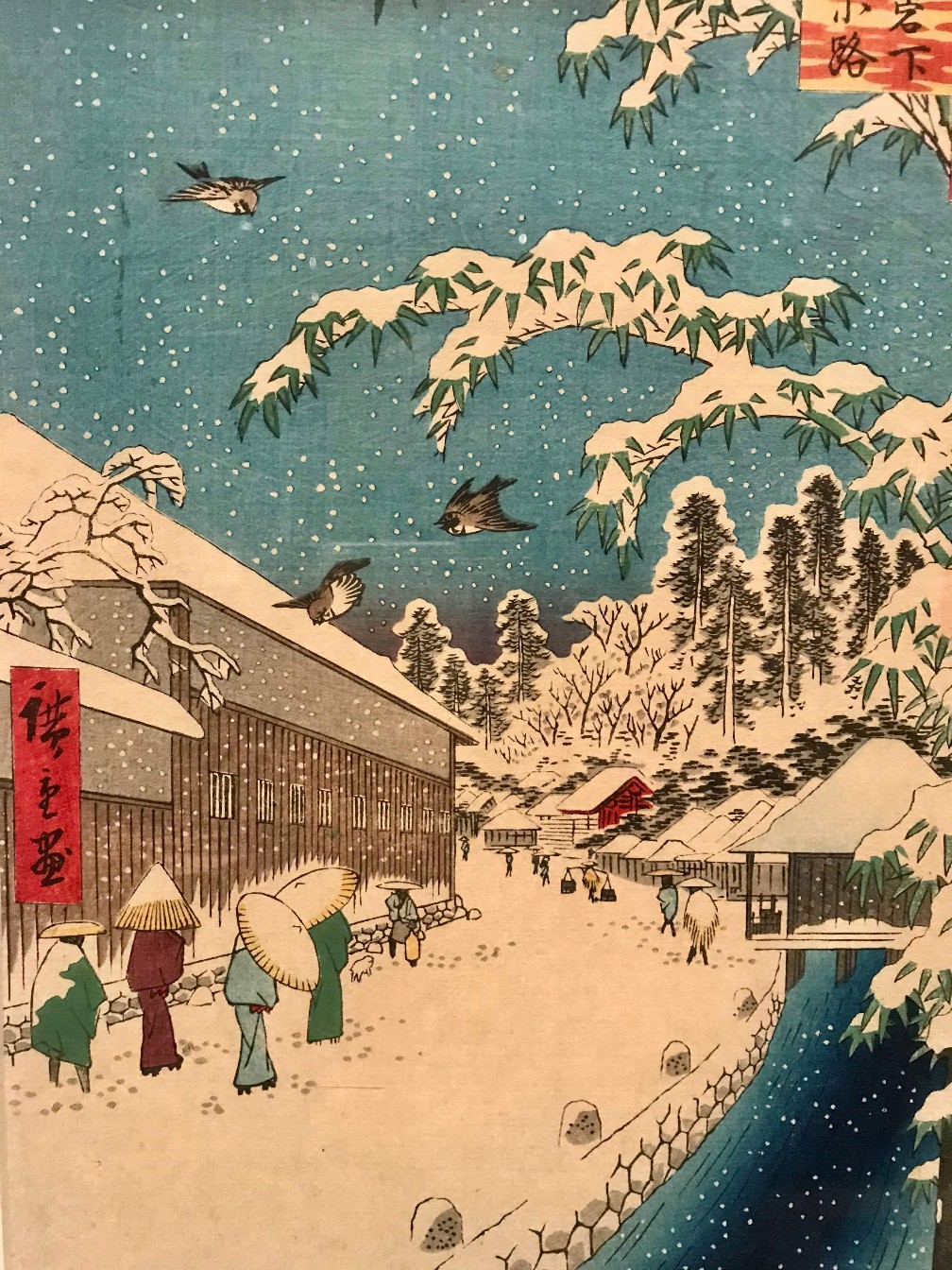 «Улочка в Ябукодзи у подножья горы Агато» автора Хиросигэ (1857 год) относится к серии «100 знаменитых видов Эдо», которая стала одной из самых переиздаваемых за всю историю гравюры укиё - э. А композиция с зимней сценой, на которой запечатлена уже в европейской перспективе дорога вдоль бамбуковых зарослей у канала Сакарагава, ведущая к воротам синтоистского святилища, стала одной из самых известных среди ста.