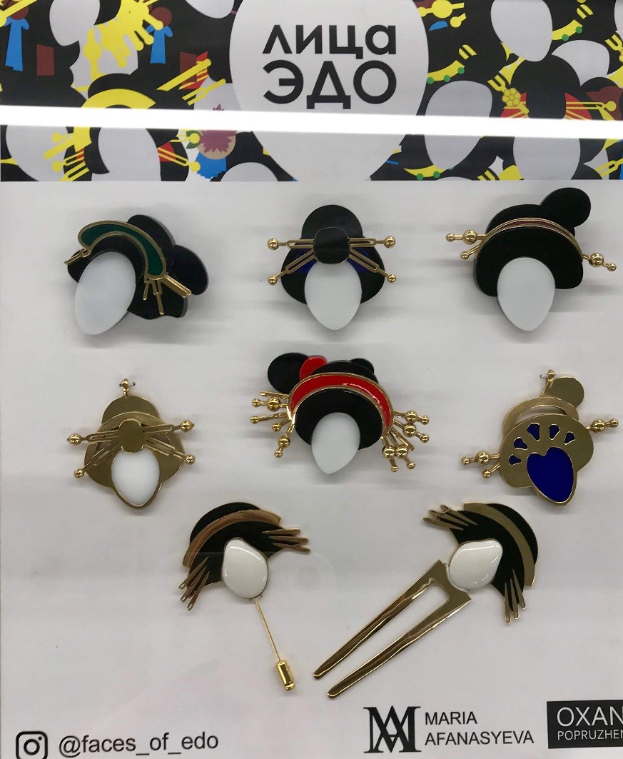 Под очарованием тонких японских линий повседневности оказались и представители Британской школы дизайна. Они переработали в упрощённые, но вполне узнаваемые формы женские лица эпохи Эдо, взятые за основу коллекции миниатюрных заколок и брошей.