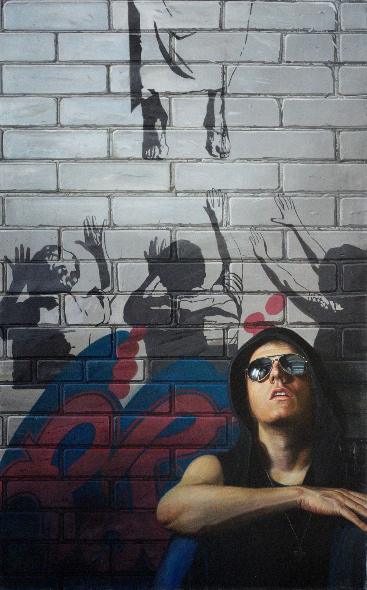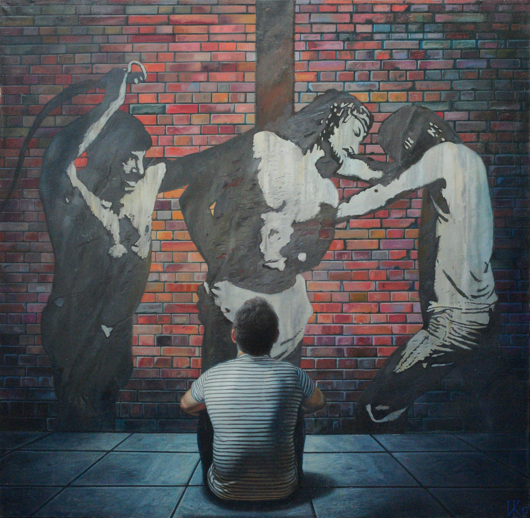 Что касается этой картины, она из всей выставки самая неоднозначная. Помимо кодов, которые считываются сразу (на граффити на стене изображено «Положение во гроб», а молодой человек стоит, смотрит в свой смартфон и слушает музыку). И тут у нас получается двоякий смысл. С одной стороны, молодой человек, который увлечен текущими делами и не видит ничего вокруг. С другой стороны, это может быть «Второе пришествие», которое для всех прошло незамеченным. Его не увидели ни мы, ни он. Иисус увлечен своими делами, мы ему уже не интересны. У него есть смартфон, он устал проливать за нас кровь.