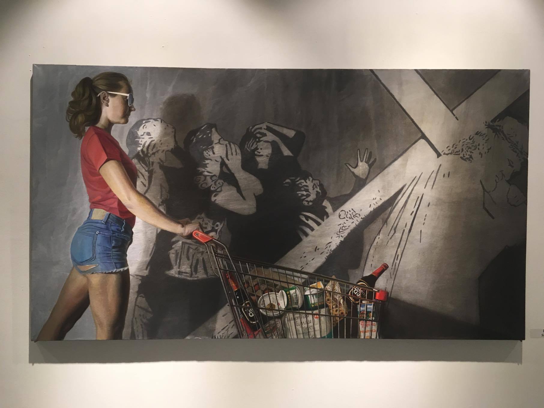 Особенного символического значения тут нет. Я просто хотел показать абсолютно стандартный продуктовый набор. Здесь на стене изображено «Несение креста». С одной стороны, кажется, что женщина стоит в ряду сочувствующих, которые идут за Христом. Но она проходит совершенно параллельно, не замечая этого. Такая критика общества потребления.