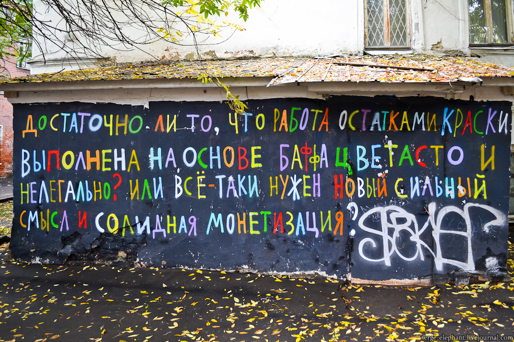 «Достаточно ли того, что эта надпись сделана остатками краски, нелегально и своевольно, или нужен какой-то дополнительный и глубокий смысл и эффектная монетизация?»