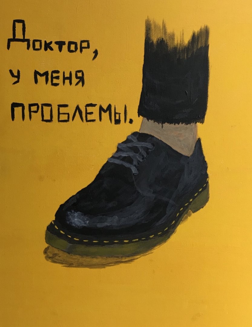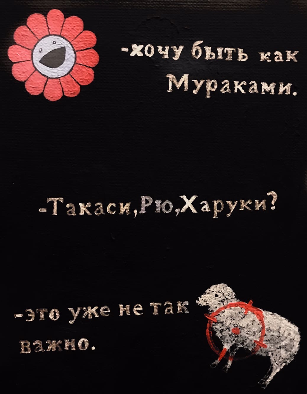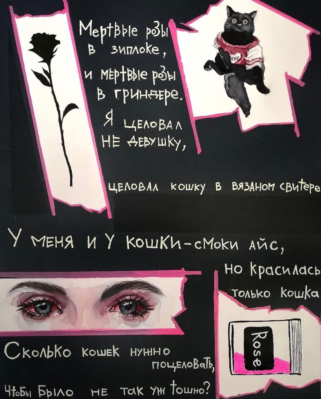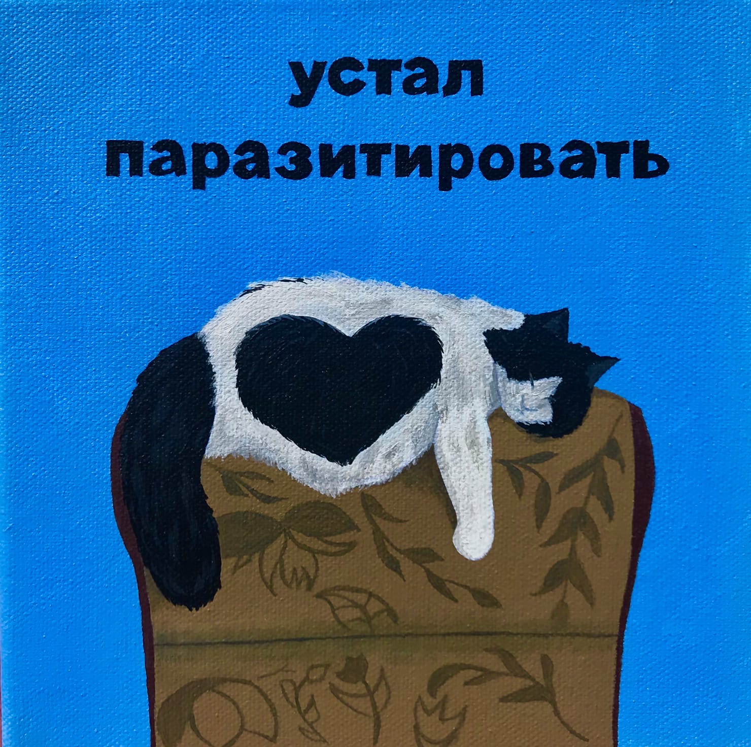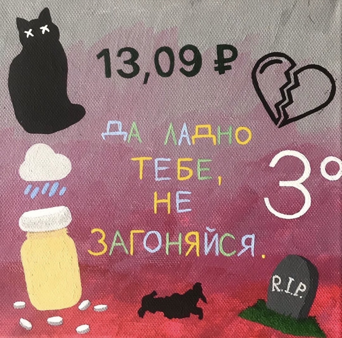 Это все периодами и зависит от настроения. Например, когда я расставался с девушкой, это были темы страданий. Когда мы были вместе, наоборот, были любовные, романтические темы. Если у меня нейтральное настроение, то я чаще всего стараюсь высмеять то, что меня беспокоит. Все эти коты, собаки — это просто мысли, которые в голове проскакивают. Я цепляюсь за какую-то из них и она превращается в образ. Чаще всего, то, о чем я пишу, меня окружает. У меня нет такого, чтобы я написал картину о том, что мне не близко, о том, что со мной не происходило. И я чаще всего беру какую-то эстетику за основу. Например, недавно я вдохновился старой девчачьей анкетой сестры и переосмыслил это.