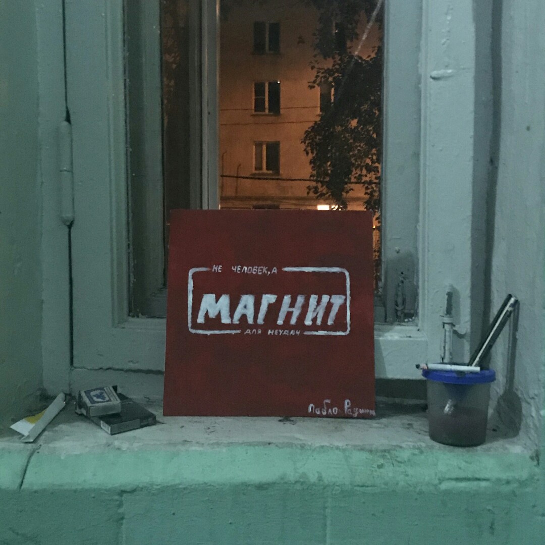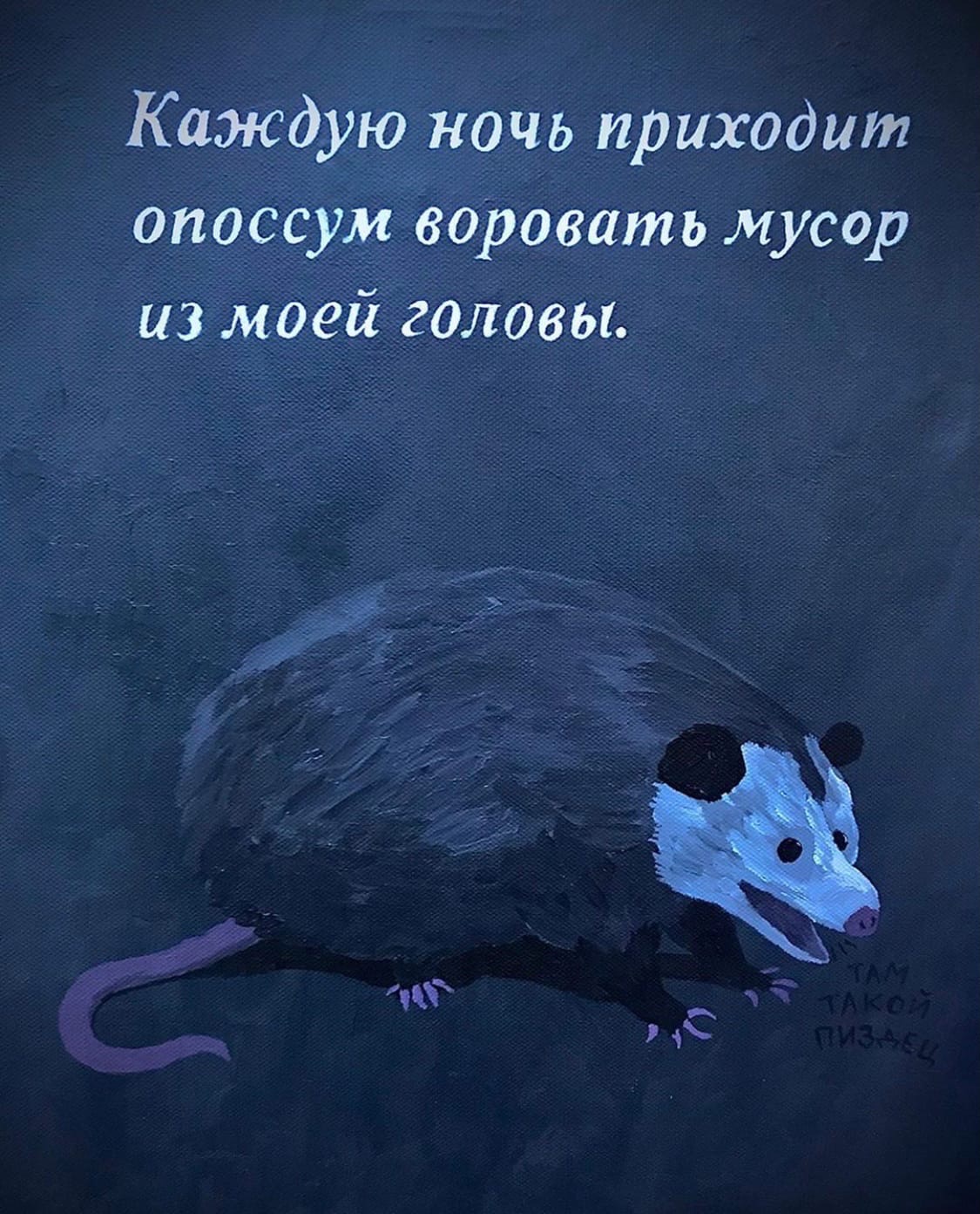 Начал я вообще не с Инстаграма и не так давно. Прошло примерно 2,5 года со старта. Дело было так: я набил татуировку у своего тату-мастера, и после этого мы с ней договорились сходить погулять. Это было наше первое свидание. Мы пили пиво на Патриарших прудах и нас забрали в полицейский участок. Там мы разговорились, и она рассказала о своей работе, доходах. И я такой: «Блин, я не хочу работать в офисе, я тоже буду тату-мастером!» Подумал, что хочу научиться рисовать. А до этого я никогда в жизни рисовал, разве что, на уроках ИЗО когда-то. И я начал рисовать минимум 6 часов в день, мог сидеть и заниматься этим с вечера до самого утра. Но в какой-то момент мой друг художник посоветовал мне попробовать писать краской. После этого я оставил идею стать тату-мастером. Мне понравилось рисовать и пошло-поехало.