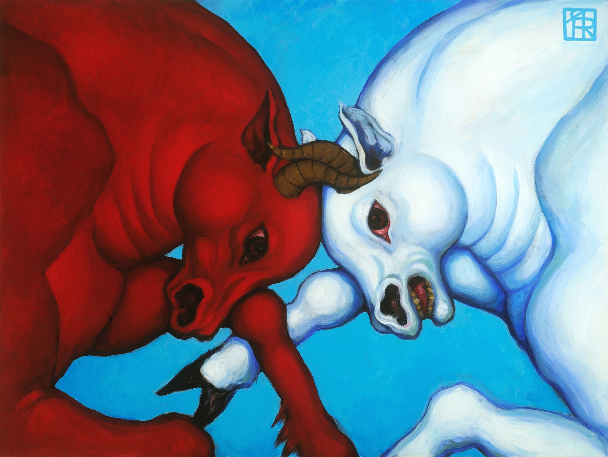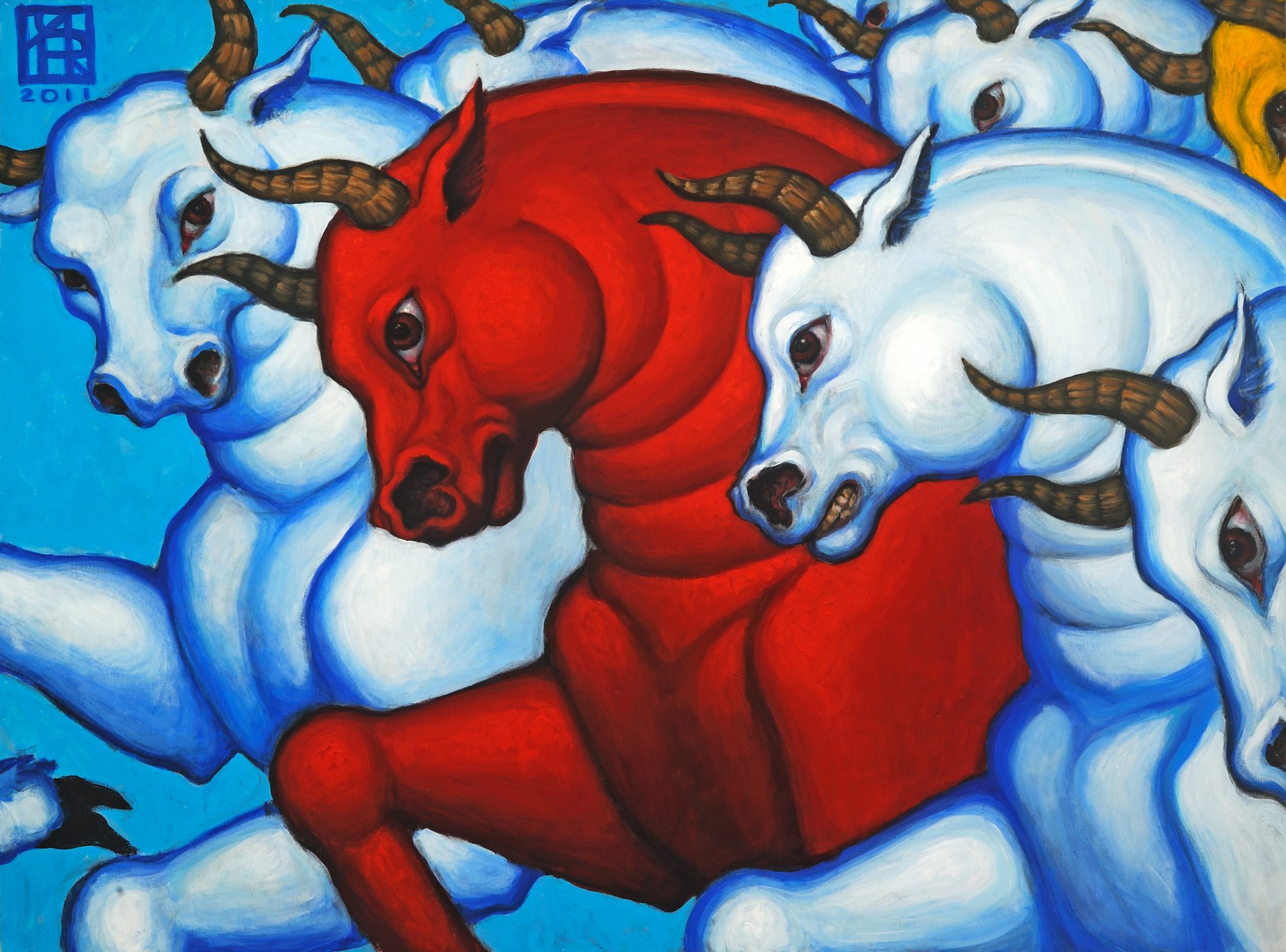 В них есть производные нашей культуры, что-то из детства, с чем мы выросли, язык, который нам был дан, существующие в нем символы, и в то же время какой-то общечеловеческий язык символов. Я думаю, что это идет из моего детства. Я живу на двух континентах, поэтому могу сказать, что это, скорее, общечеловеческие символы, нежели сугубо культурные. Хотя, конечно, избегать этого невозможно, да я и не стараюсь. Мы все живем в определенной культуре. Например, мои картины с быками — отчасти глубокое воспоминание о фильмах про революцию, которые без конца прокручивались на нашем любимом телевидении, когда я росла. Все эти огромные массы, несущиеся куда-то под руководством того или иного лидера… Наверное, с этого времени для меня эта сила - «несущаяся», «народная» — совершенно поразительное интенсивное зрелище, одновременно пугающее и завораживающее.