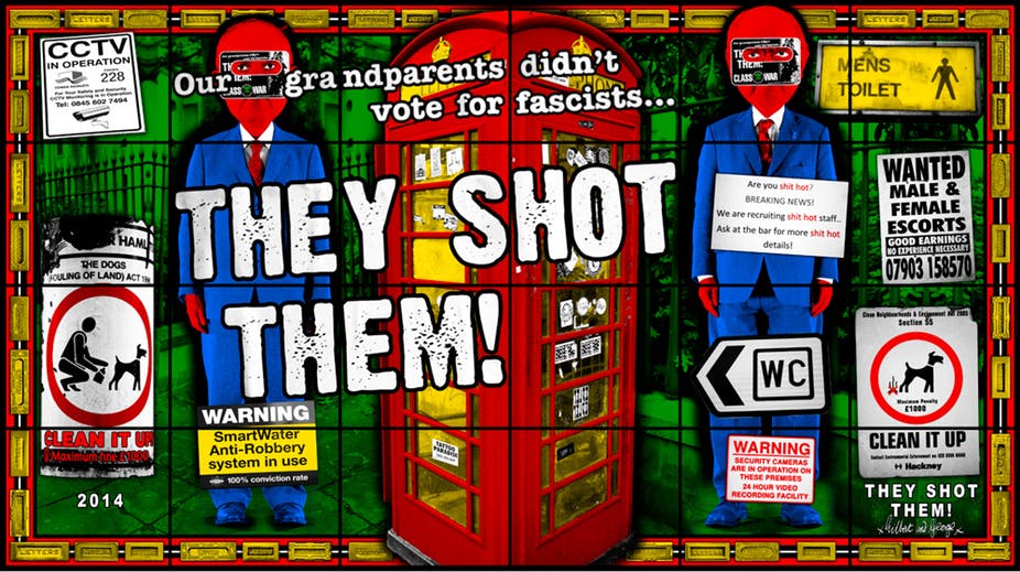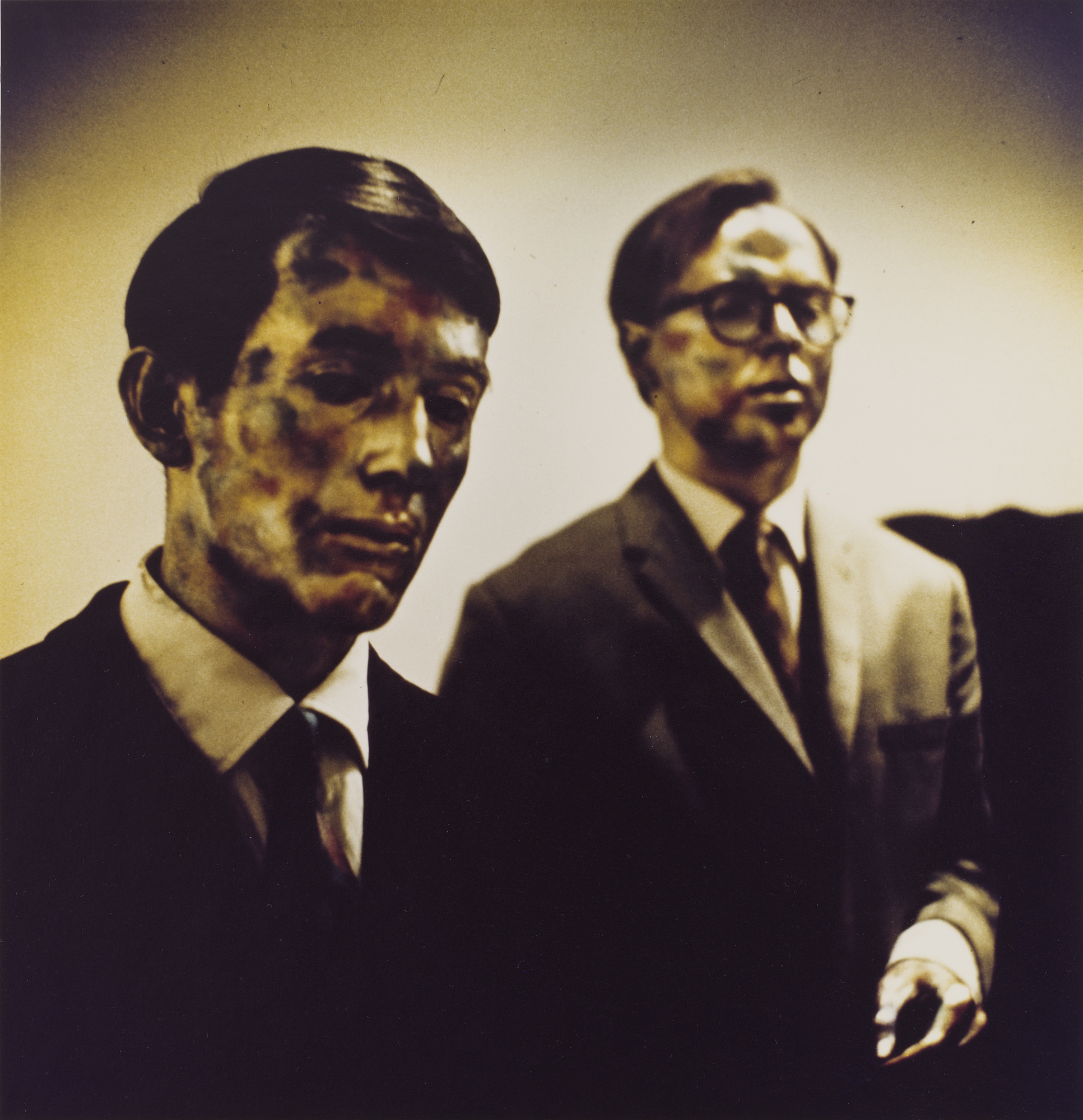 За страшными надписями художники прячут свои лица. Вглядываясь в них, можно заметить презрение и осуждение, с которыми Гилберт и Джордж относятся к тем, кто не желает решать эти общественные проблемы.