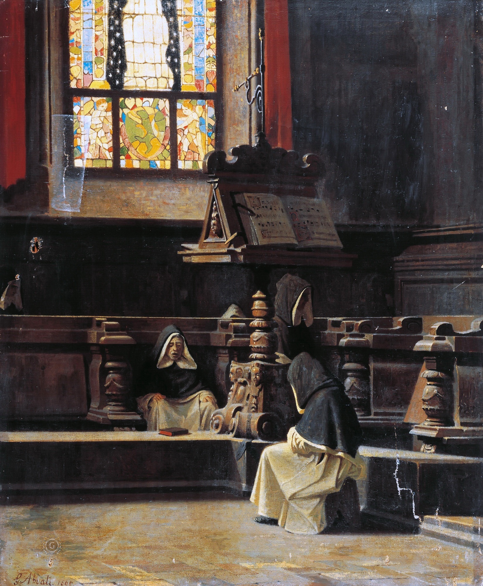 Любовь к моменту «падения света» объединяла Маккьяйоли. На картине «Монахи в ризнице» (Inside the sacristy with monks, 1865) Аббати решил остановить световой поток внутри католического собора. Присмотритесь – на этой картине видны все оттенки солнечного луча. Падающий через витраж свет, блики на деревянных сидениях и каменном полу – все эти объекты освещены по-разному.