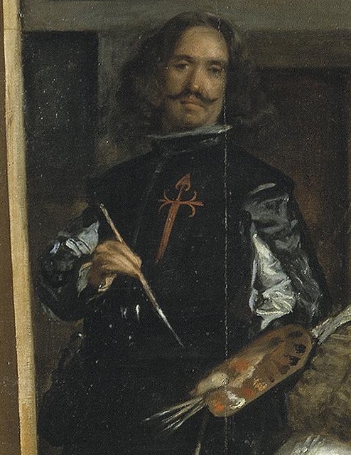И, действительно, нас, зрителей, встречают напряжённые взгляды некоторых участников этой сцены, включая самого художника. И эти взгляды устремлены куда-то за пределы художественного пространства картины. Так, Веласкес изображает себя в обычной позе художника, который отступил на шаг от холста и, вроде бы, смотрит на модель, словно сравнивая её с тем, что уже получилось на полотне.