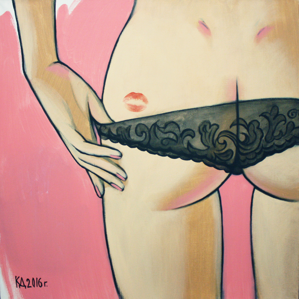 Что касается «ню» - это определённо образ. Если в натюрмортах я иду от ощущений тепла и уюта, которые пытаюсь создать, то в «ню» хочется передать зрителю какой-то кусочек истории, чтобы он задумался. Очень нравится играть смыслами, и если это получается, то работа становится моей любимой. А вот, например, картина. Люди часто подходят и спрашивают: «А кто это? А почему у неё поцелуй на попе? А как она так себя поцеловала? А она хотела или не хотела?» (смеётся) И вот это здорово, когда зрители начинают что-то придумывать, когда у них мозг начинает работать.