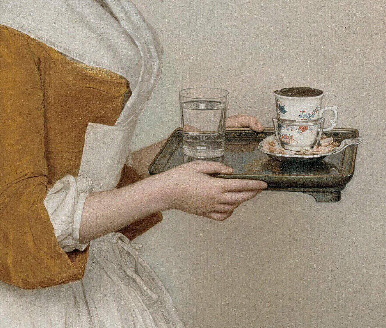 Он сумел создать жанровую сценку: глаза девушки опущены, но заметно, что она хорошо осведомлена о своей привлекательности. Цвета одежды гармоничны: светло-серая юбка, блуза цвета охры, белоснежные косынка и фартук в складках, шелковый чепчик, скрывающий волосы… Открытое пространство перед моделью создает впечатление того, что она не застыла, а продолжает движение, аккуратно неся поднос, дабы не пролить модный и дорогостоящий шоколад. Дело в том, что в XVIII веке он был экзотическим лакомством, ставшим напитком класса люкс при дворах Европы. Его исключительность подчеркивалась в том числе дорогими фарфоровыми чашками, стоящими на серебряных или золотых блюдцах, в которых подавался напиток.