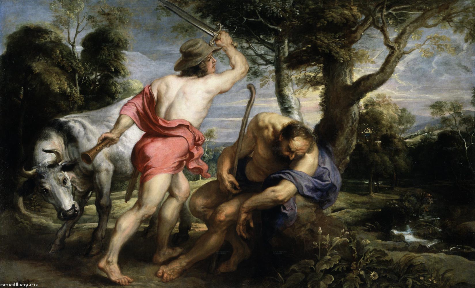 Впрочем, выяснилось, что в горах у неё есть влиятельные родственники, которые кое-кому позвонили и помощь пришла. Пришла в лице пастуха со свирелью. Тот как бы невзначай проходил мимо, играл, Арг услышал игру и пригласил на чашечку чая. Долго говорили о том, о сём, пастушок рассказывал как была изобретена свирель. Рассказывал так томно и нежно, что в конце концов Арг заснул всеми ста глазами сразу. Для надёжности пастушок сыграл мелодию из «Титаника» и, убедившись, что титан не реагирует, отрубил ему голову. Этим пастушком был Гермес (его атрибуты на картинах это знаменитые пафосные крылатые сандалии и посох, нагоняющий по легенде сон).