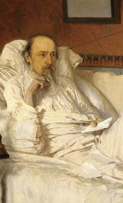 Я всегда вспоминаю его «Портрет Н.А. Некрасова в период «Поздних песен». Как тут всё выстроено по композиции, какие детали. Поэт уже на смертном одре. Чай, морфий, колокольчик, исписанные листы. Этикетка от лекарства на полу. Идеально белая простыня, которая так на погребальный саван похожа. И вот тут-то на контрасте бросается в глаза деталь. Та, которая формирует весь тон картины.