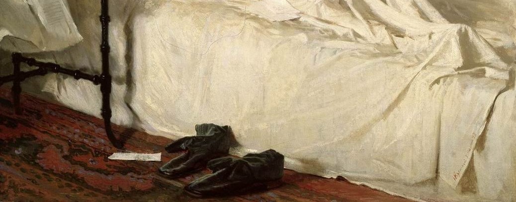 Помните легендарный печальный рассказ Хемингуэя? «Продаются детские ботинки. Неношеные». Вот и здесь чёрным пятном новые ботинки прямо в центре картины. И вам уже ясно. В них никто никуда не пойдет. Их наденут, точнее оденут на труп. Для дороги в церковь и последнего пути. Того пути, в котором уже не будет шагов. Не этот ли путь видит Некрасов, поглаживая бороду и смотря в никуда? От белого савана и чёрных ботинок наш взгляд скользит вверх, упирается в колокол. Он пока не звонит…