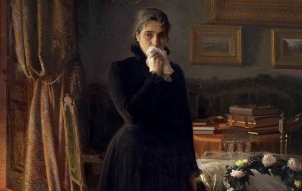 Дама на картине в настоящем шоке, как будто сломался двигатель жизни. Вокруг пустота, и цветы, кажущиеся неестественно яркими в такой обстановке, только ещё больше подчёркивают это. Самое большое горе — это не заломанные руки, это не фонтаны слёз. Настоящее, неутешное горе всегда молчаливо, оно напоминает шок. Вот и у женщины на полотне оцепенение. Она невидящими глазами смотрит в никуда, руки её нервно вцепились в платок. А на лице такая печаль, бездонная, чёрная, непроходимая.