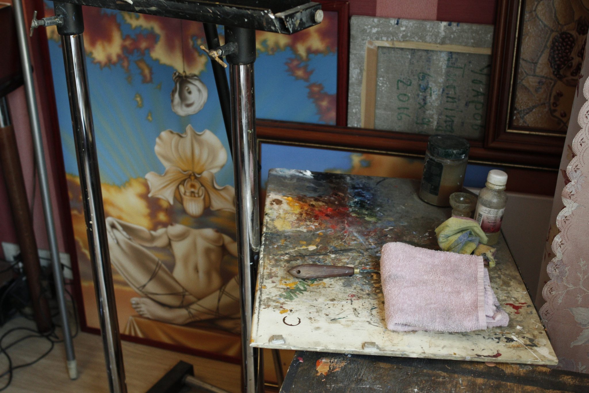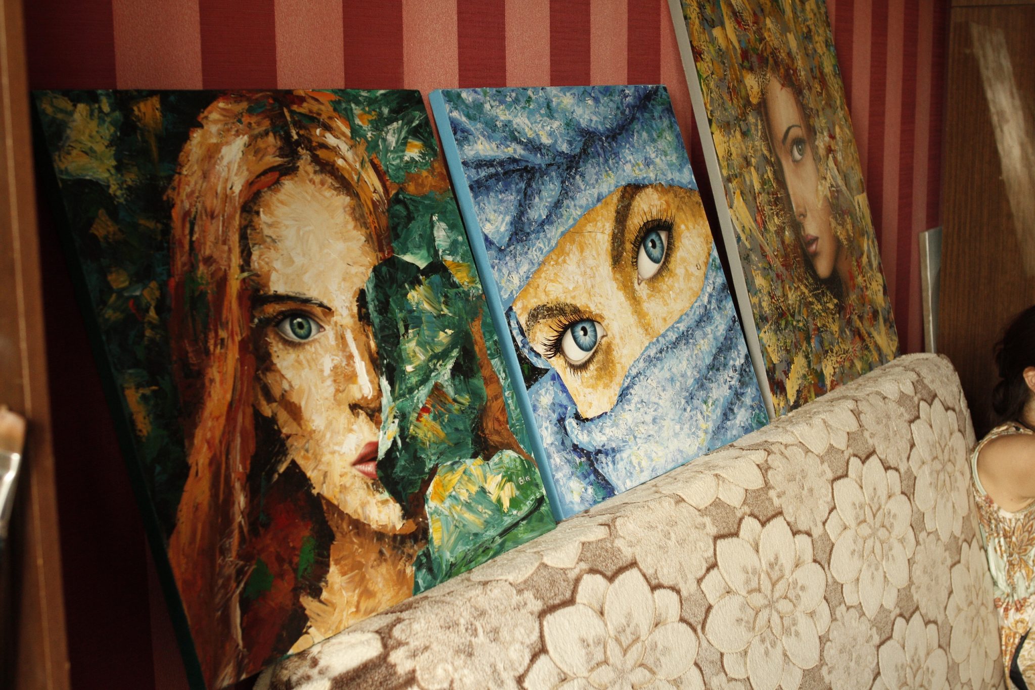 Я давно смотрел за мастерами, которые работают в мазковой технике, мастихином. Мне всегда это было интересно. А два года назад мы с компанией «Мы» провели несколько арт мастер-классов на атомных станциях для раскрытия творческого потенциала людей, для сплочения коллектива. И помимо кистей, я начал показывать, как работать мастихином. Начало что-то получаться, и мне захотелось это реализовать. Это два абсолютно разных подхода: если обычную картину я пишу в течение месяца-двух, а иногда и трех, то здесь — день-два-три. И из-за того что я делаю картину так быстро, нужно, чтобы не было случайных мазков, это немножко не характерная для меня техника, но я ее развиваю, чтобы выработать у себя иной подход к живописи. А «Взгляд» — потому что я много обращаю внимания на глаза, исследую взгляд человека. Взгляд ГЛАЗА в глаза — это некая искренность, отражение души.