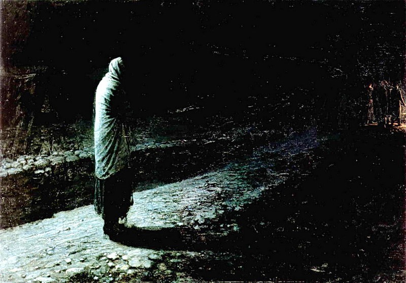 «Совесть. Иуда» Николая Ге. История сообщает нам, что произошло, когда Иуда понял, что совершил. Он вернул серебряники, после чего пошёл и повесился. И эта часть раньше как-то игнорировалась, неудобно потому что. Это же выходит, что не жадность всему виной, да и на рогатого свалить не получается. До самоубийства Иуду довело раскаяние. Буря настоящих человеческих чувств. Вины, сожаления, горя, душевной боли. А это значит, что он просто человек, который разочаровался в другом человеке. В Средневековье разочаровываться в Иисусе было опасно для жизни, в эпоху романтизма это стало важнее, чем принимать его как совершенный идеал. Поэтому картина Ге очень символична. Иуда там стоит и смотрит, как его учителя из-за него ведут на мученическую смерть. Видно только его фигуру, но остальное ясно и без деталей. Этот человек остался один на один со своим поступком, и мы знаем, что будет дальше. От этого картина приобретает острый драматизм. Чувства и мысли буквально видны.