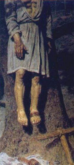 И Коржев гениально передал трагичность судьбы этого человека в своей картине. Он не изобразил его с излишне скорбной миной и закатанными глазами. Не показал синее лицо и вывалившийся язык, он вообще не показал лицо Иуды. Только тело, свисающее откуда-то с чердака в маленькой каморке. И злополучные 30 серебряников, упавшие на пол. Вся трагедия выражена по скромному величественно, как все настоящие трагедии. Эту картину блестяще описывает цитата Симоны де Бовуар: