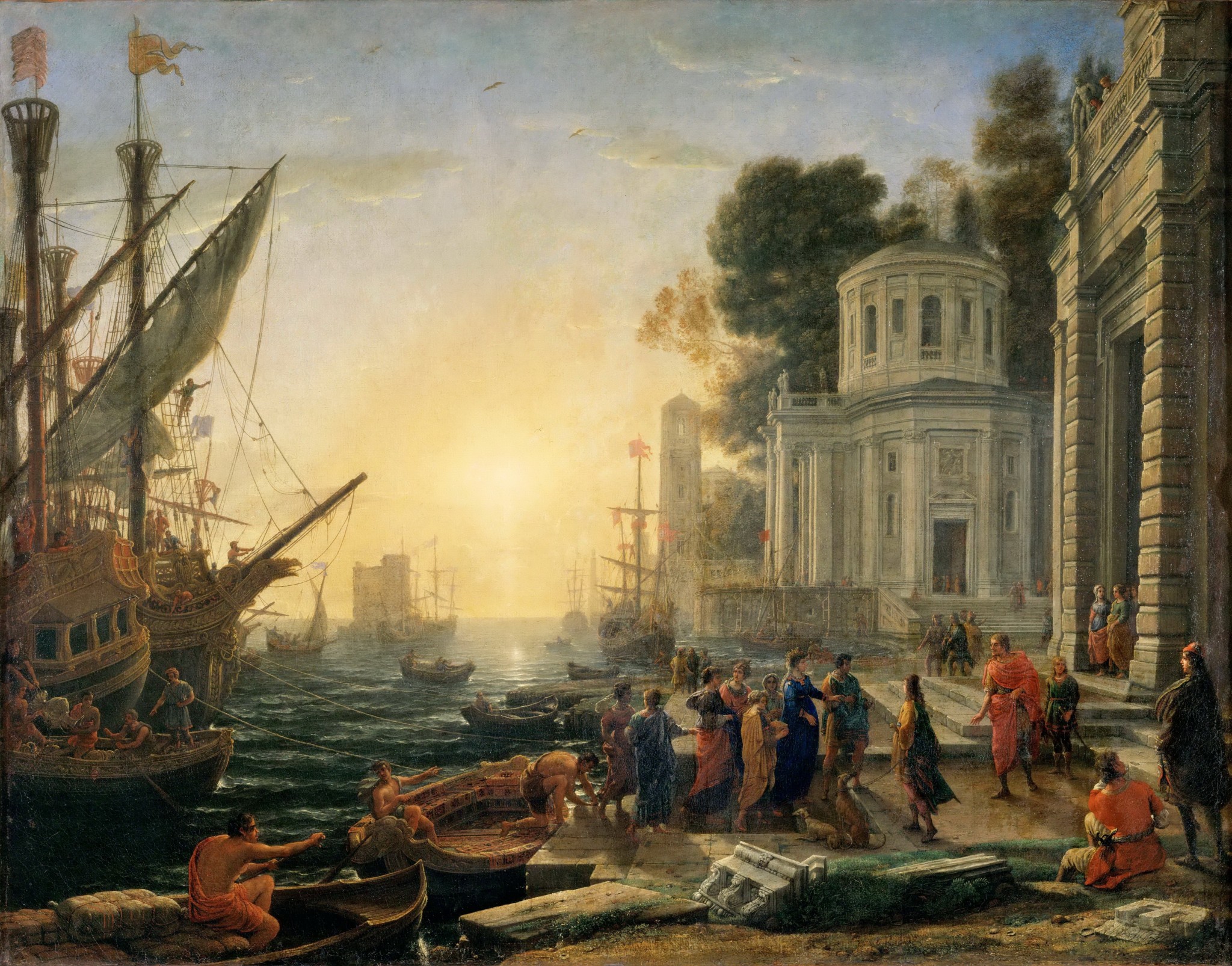 Но усерднее всего он изучал искусство и секреты пейзажной живописи. Часто «главными героями» работ Лоррена были морские порты, залитые лучами солнца. «Прибытие Клеопатры в Тарс» (1642) – картина, очевидно, рассказывающая о прибытии царицы Клеопатры в город Тарс. Но зритель, увидевший полотно, вправе усомниться в том, что в этой работе исторический сюжет важнее пейзажа.