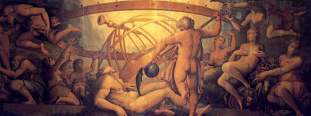 Для начала пару слов о происхождении нашего мясоеда. Итак, когда-то давно мира ещё не существовало, был только Хаос и Тaртар (не соус) – некая мрачная бесформенная материя. Что-то вроде Зауралья, но больше. Потом из этого Тартара появились сначала Ночь, Туман, потом День (причём до бога Гелиоса, он же Солнце, ещё далеко. Странная логика, но простим греков: подсмотреть им было негде). У этой братии есть имена, но я не стану грузить всеми подряд, нам хватит и тех, кто в этой истории на правах главных. И вот тут пара таких как раз появляется – Гея, она же мать – земля, прародительница всего и вообще мировая женщина. А также Уран – небо. Его Гея породила, а потом он стал её мужем и заделал ей много много детей, одним из которых как раз и является Крон, он же Кронос, он же Сатурн.