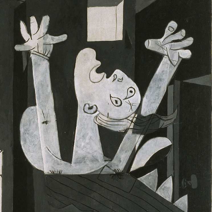 Легенда гласит, что к Пикассо подошел германский офицер и, вынув из кармана фотографию «Герники», спросил: «Это сделали вы?» «Нет, — ответил живописец, — это сделали вы». В правой части картины фигуры бегут прочь от горящего здания, из окна которого падает женщина.
