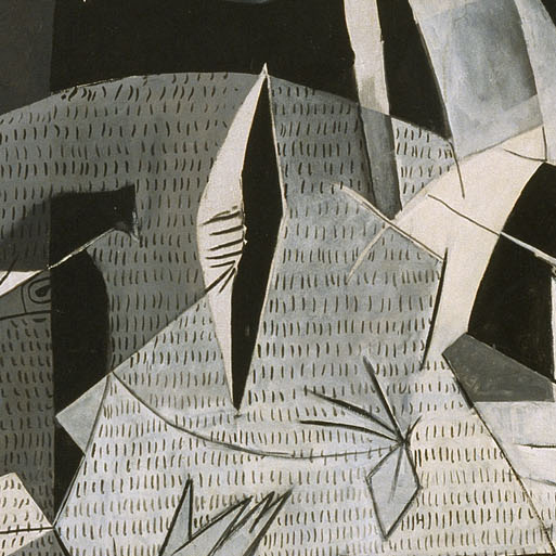 Также мы видим скрытого темнотой голубя — один из многогранных символов Пикассо. Версия Пикассо с мучительным выражением лица птицы и разбитым телом предполагает символ разрушения мира.