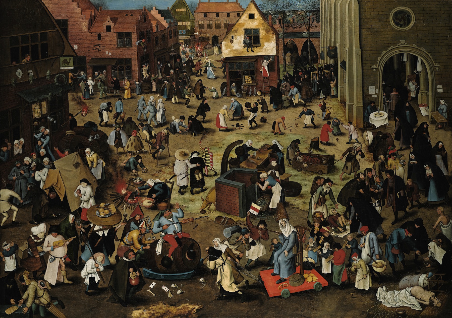 Перед нами картина «Битва масленицы и поста». Пост проиграл. Это сплошная похвала глупости. Пьяные люди, калеки, нищие… Их мы видим в первую очередь. Только дети играют в игры, не обращая внимания на причуды взрослых. Люди уже выходят из церкви, выходят, чтобы присоединиться к оргии. Прямо по центру на бочке восседает толстяк. На его ногах – котелки, не голове – пирог. Забавный перифраз Иеронима Босха, его демона обжорства из триптиха «Сад земных наслаждений». У Босха демон пугает. У Брейгеля он смешон.