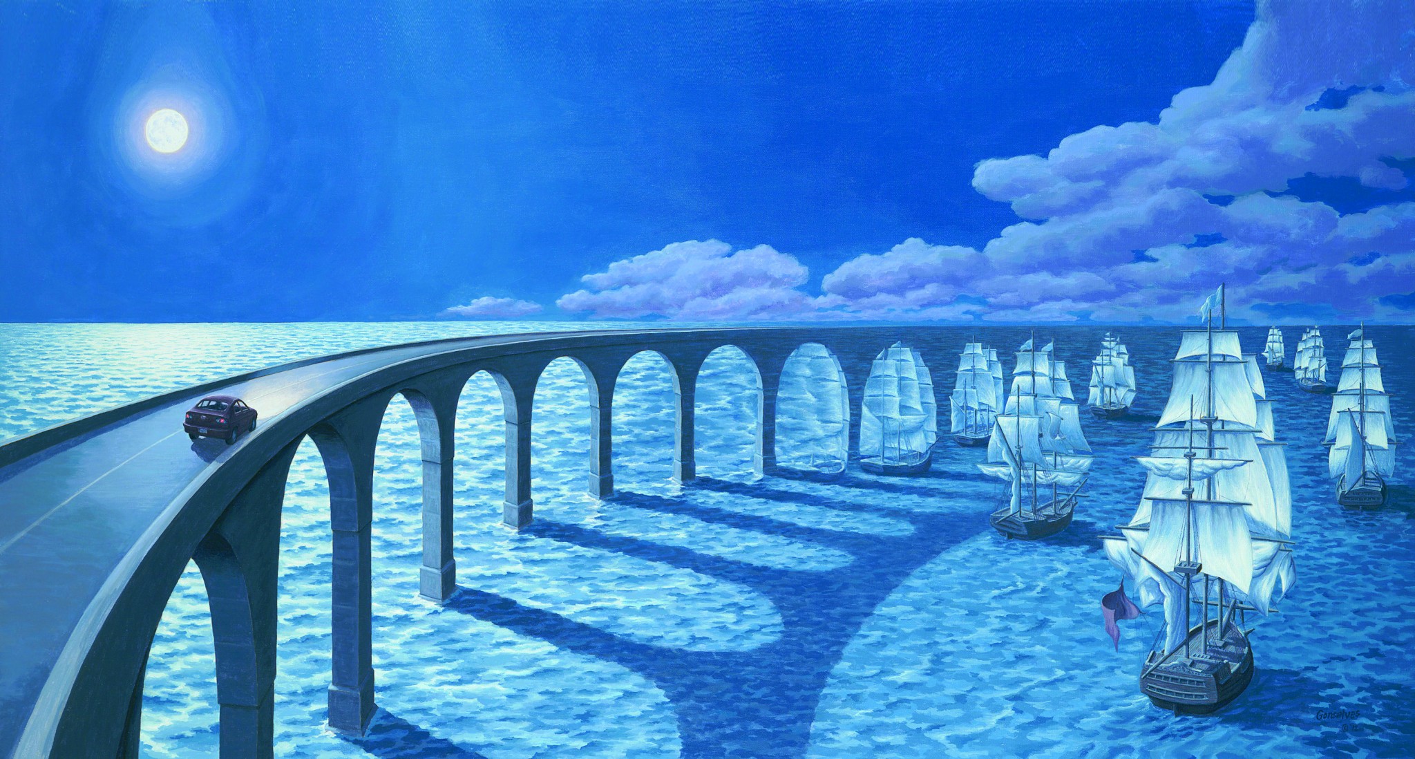 Обычно на его полотнах можно рассмотреть как минимум две разные композиции, плавно перетекающие друг в друга. Например, в работе «К горизонту» (Toward the Horizon) арочные пролеты автотрассы постепенно превращаются в парусные суда, а дорога сливается с границей моря и неба.