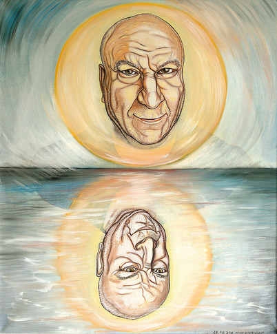 Вообще он давно меня уговаривал, чтобы я нарисовала его портрет. Я предупредила, что сделаю. Но то, как я его нарисую, будет законченным произведением, и я не буду ничего менять. В итоге получилась такая картина. Верхний портрет - это Бог. А нижний смотрит на Бога. Они отличаются, в этом мой юмор, в этом и есть его тщеславие. Он же все время говорит: «Я не БАХдасаров, я БОГдасаров». И поэтому я разделила его фамилию на БОГ и ДАСАРОВ. Бог наверху, а внизу - Дасаров, который любуются своим Богом. То есть, он любуется сам собой. Михаил, когда увидел это, обиделся страшно, подумал, что я его оскорбила таким образом. Но потом, через какое-то время, когда он понял смысл моего юмора, сказал: «Да, ты права. Так и есть». Актеры вообще очень тщеславны.
