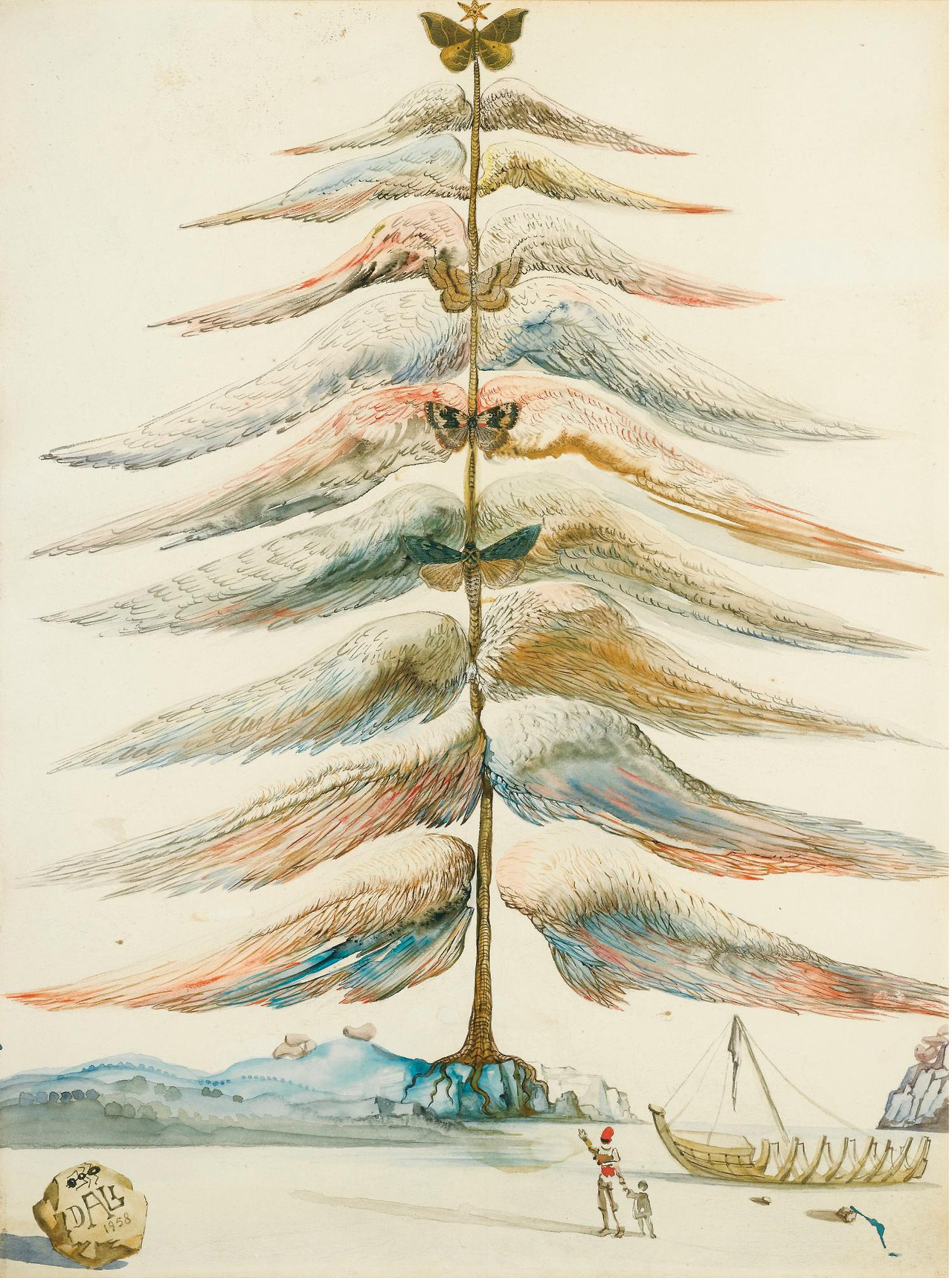 Любопытно, что такие классические атрибуты испанского Рождества, как католические сценки на тему рождения Иисуса или поклонения волхвов, практически отсутствуют в эскизах мастера. Зато американские и европейские элементы Рождества, например, ели, символизирующие главные события уходящего года, Дали использовал довольно часто.