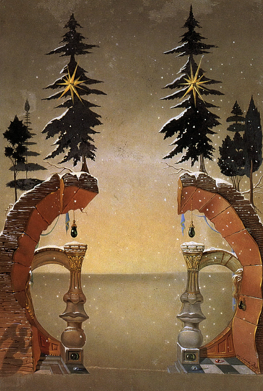 Слегка покрытые снегом и увенчанные елями элементы архитектуры были расположены симметрично и образовывали облик женского лица. Эскиз являлся ярким примером новогоднего волшебства, выдержанного в стиле творчества автора.