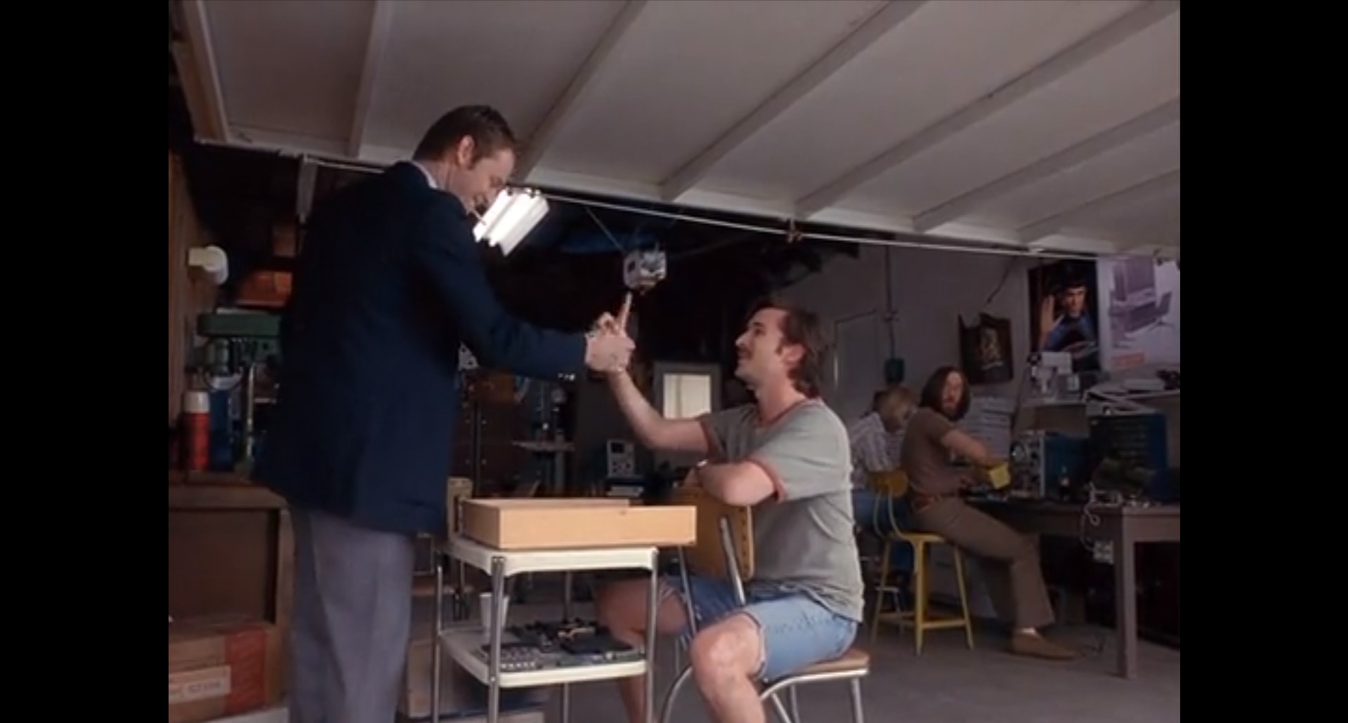 Фильм «Пираты Силиконовой долины» начинается с имитации съёмки «1984» под руководством Ридли Скотта. Эту рекламу Стив Джобс хотел сделать невероятно дерзкой. Размышляя над тем, что должно получиться, он говорил: «Я хочу, чтобы люди онемели от изумления, застыли, как громом поражённые!» И это удалось. В ролике от Полиции мыслей убегала девушка-атлетка. На ней была надета белоснежная футболка с надписью Macintosh. В порыве отчаяния перед неизбежной расправой за своё ослушание и жгучей ненависти к сложившейся системе она бросает огромный молот и вдребезги разбивает широкий экран, с которого традиционно вещает Большой брат. Нетрудно догадаться, что это скрытая отсылка к IBM. Почему была избрана именно такая концепция? Всё довольно просто - это был вызов. Apple – единственная независимая компания, стремящаяся нарушить застой в компьютерной сфере. Она хочет освободить людей от гигантских корпораций, не способных дать миру ничего нового. Macintosh в этом контексте - орудие, которое сначала изменит ход мыслей каждой отдельно взятой личности, а затем сломает всю скверную систему. Стив Джобс – вольноотступник, борец за духовность, за права и свободу. И совсем неслучайно над зданием Аpple развевался флаг весёлого Роджера. Основатель компании так жил и чувствовал. Во всяком случае до того момента, когда второй раз начал свою историю.