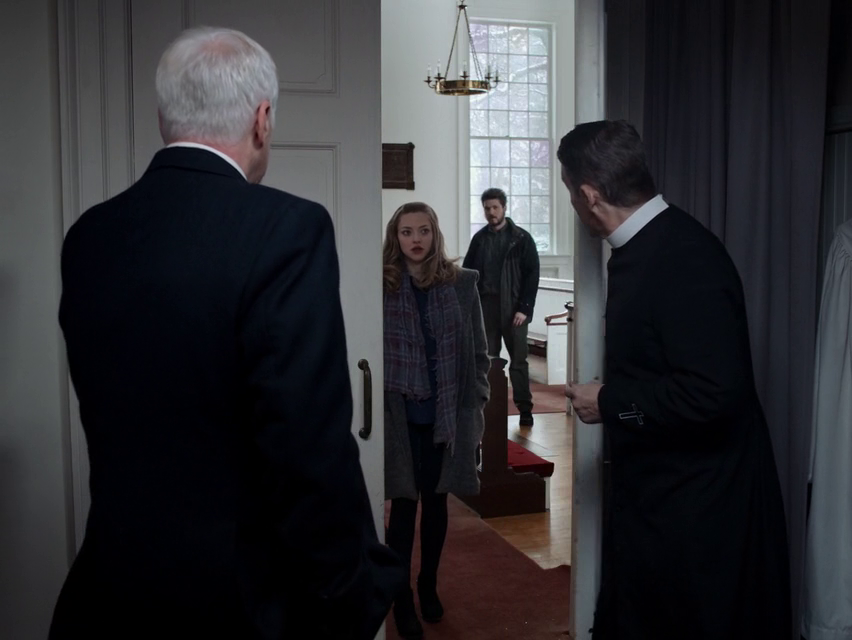 Пастор беседует со своим прислужником в затемнённом помещении. Половину кадра занимает прислужник. Он стоит на переднем плане слева вполоборота спиной. Перед ним на шаг вглубь кадра и лицом к зрителю – пастор. Казалось бы, появись тут другие действующие лица, то всем бы в кадре стало очень «тесно». Но раздаётся стук в дверь, расположенную между пастором и прислужником, пастор дверь открывает, а вместе с ней открывается и новое пространство – в появившемся светлом проёме возникает девушка, а дальше виден её муж. В кадр идеально вписаны четыре человека. Класс.