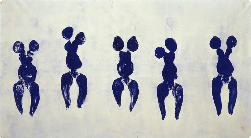 Живопись представлялась Иву Кляйну тюрьмой, но, экспериментируя с форматами, художник прошел путь «выхода из живописи», достигнув акционизма. Когда синий в его экспериментах «стал пустотой», новые попытки работы с натурщиками привели к мысли, что писать можно не натуру, а вместе с ней. Раскрыв покровы мастерской, Ив Кляйн перевел человека из пассивной роли натурщика в само произведение, где процесс стал искусством наравне с результатом.