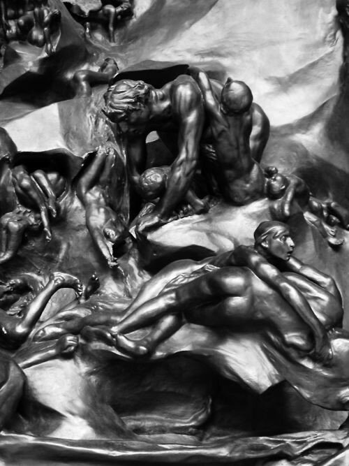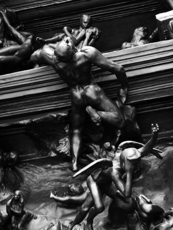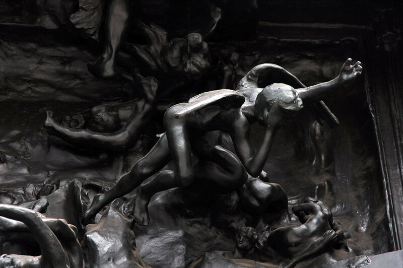 А композиция разрастается, и из ткани врат вылезает фигура, которая отчаянно хочет выбраться наружу. «Я не вижу ничего, кроме бесконечности, и мой разум наполнен страхом падения,» — говорил Роден. И скульптура Икара превращается в падшего ангела, любовник превращается в падшую душу, которая пытается вырваться из бездны, но вот-вот сорвётся вниз.