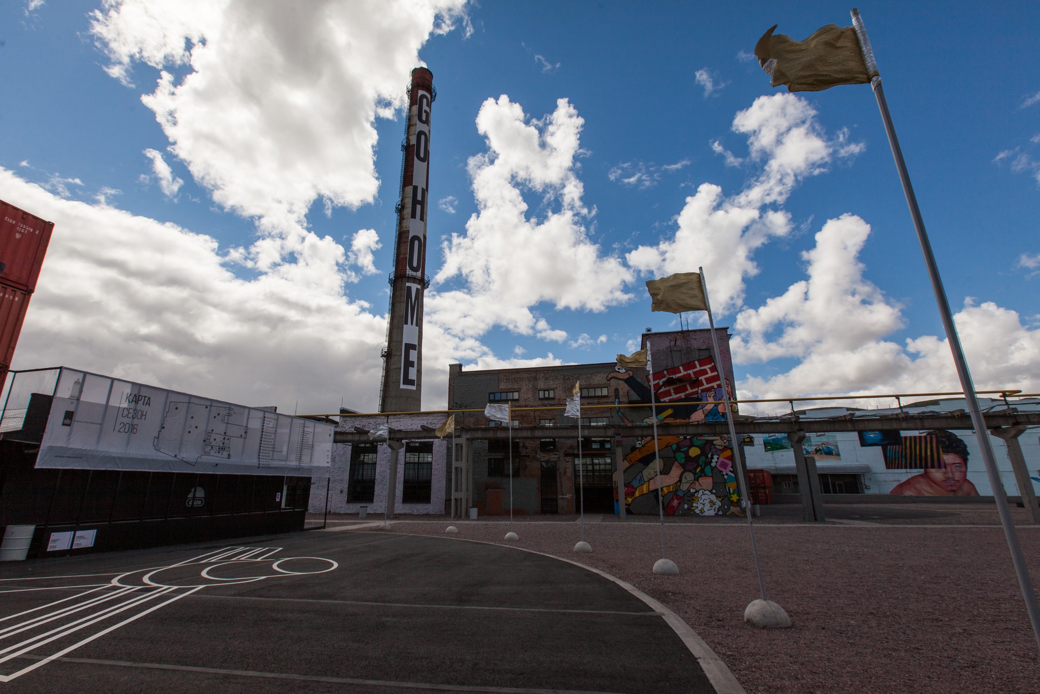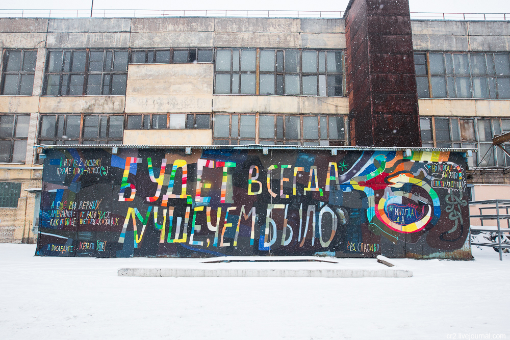 Производственная территория устроена как «город в городе». Тут есть свои улицы, структура и архитектура, а корпуса и цехи как раз отлично подходят для граффити. Что примечательно, названия улиц достаточно необычны: «Тупик цивилизации», «Потусторонняя улица» делают из самого завода масштабный арт-проект.