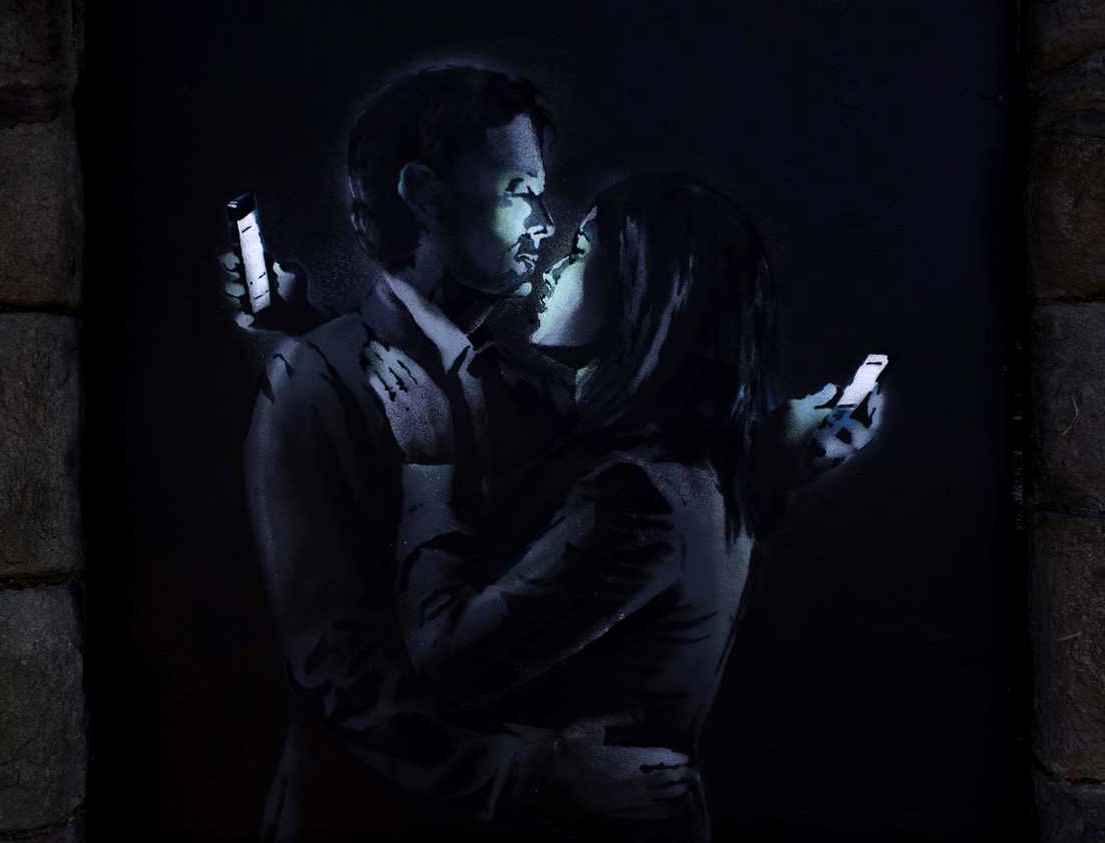 О чём же эта картина, «Мобильные любовники»? О поколении социальных сетей и смартфонов. О превалирующей ценности виртуальных собеседников над реальными, о невозможности выпустить из рук заветный прямоугольник даже во время свидания. Бэнкси изобразил любовников, в разы больше увлечённых своими телефонами, чем объятиями друг друга. И это не выдумка художника, это реальный мир.