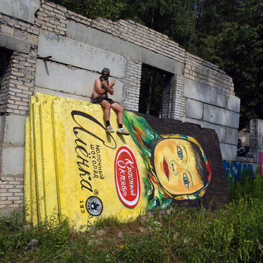 Еще одной работой Павла была исполненная на бетонных плитах шоколадка «Алёнка». Художник когда-то снял фильм «Сказка про Аленку 2005», где знаменитое лакомство являлось образом современного ребенка. Павел 183 считал, что:
