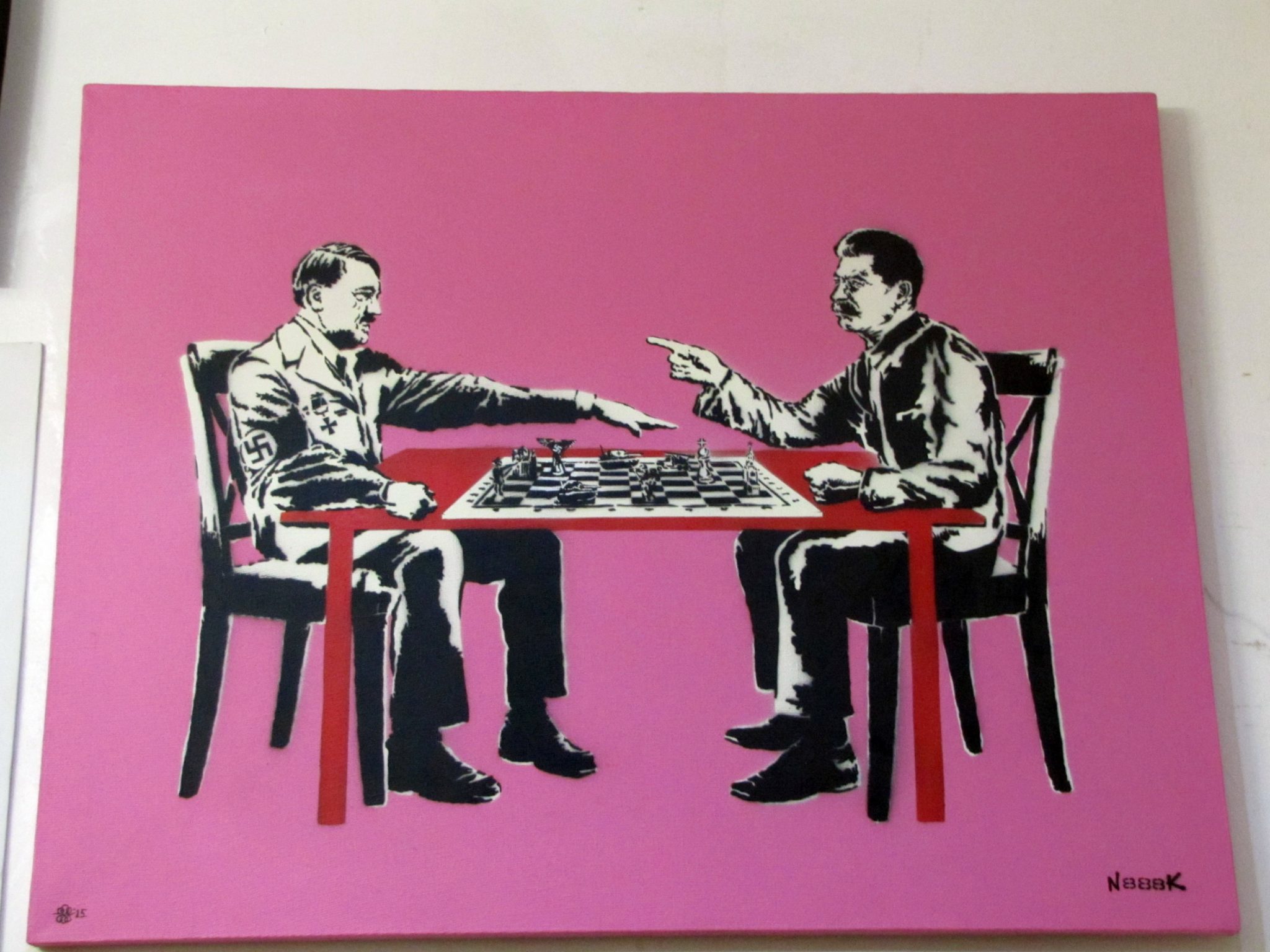 Произведения Николая пытаются вести диалог со зрителем, и у меня он состоялся с картиной «Игра» (The Game, 2015), на которой изображен поединок Иосифа Виссарионовича Сталина и Адольфа Гитлера. Вожди сидят за шахматной партией, на доске не простые фигуры, а танки, ракеты, здания. Таким необычным способом художник показал бои, разворачивавшиеся в ходе Второй мировой войны.