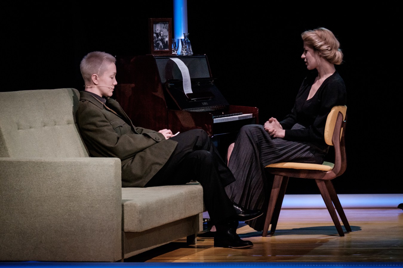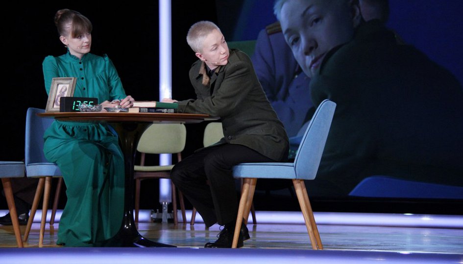 Комический эффект достигается безупречно. Это и есть реально воплощённые идеи-мечты тех, кто жил более ста лет на этой земле. На мой взгляд, именно время и является главным героем в постановке К.Богомолова. В виде светящегося табло оно постоянно присутствует на сцене. Электронные часы стоят на столе в окружении мебели, напоминающей стиль бидермейер.