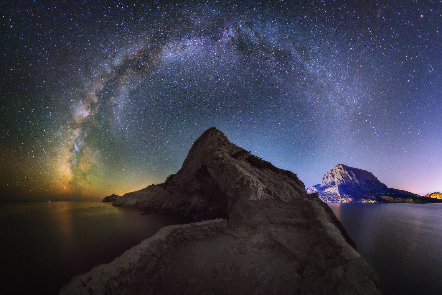 Все началось в августе 2014 года. Тогда я решил поехать в Крым, чтобы отдохнуть и пополнить альбом новыми фотографиями. Я был наслышан о красивых ландшафтах Нового Света, просмотрел множество работ других фотографов, и мне очень хотелось видеть эти места на своих снимках. Самым впечатляющим местом был грот Голицына – огромная пещера, скрывающаяся от туристов за выступом горы Коба-Кая. Я был поражен масштабами и красотой, открывшейся глазу. Решил, что непременно сниму это место ночью. На южной стороне Коба-Кая находился «небольшой пятачок», с которого можно было сделать отличную панораму. Но гора была в двух метрах от камеры, и несколькими кадрами нельзя было обойтись. Моя попытка сделать этот снимок так, как я его представил, в тот день не удалась. Причиной стало отсутствие большого опыта панорамной съемки, да и штатив не был приспособлен для этого. Самое обидное: ночью в августе центр галактики Млечный Путь уже скрывался за мысом Капчик. Уже тогда я понимал, что единственно возможный месяц для съемки задуманной композиции – июль. Подготовившись, я вернулся в Крым в июле 2015 года. Я дождался момента, когда галактика будет строго над головой, тогда и приступил к съемке сферической панорамы. Меня композиция очень порадовала и впечатлила, и я рад тому, что она впечатляет других.
