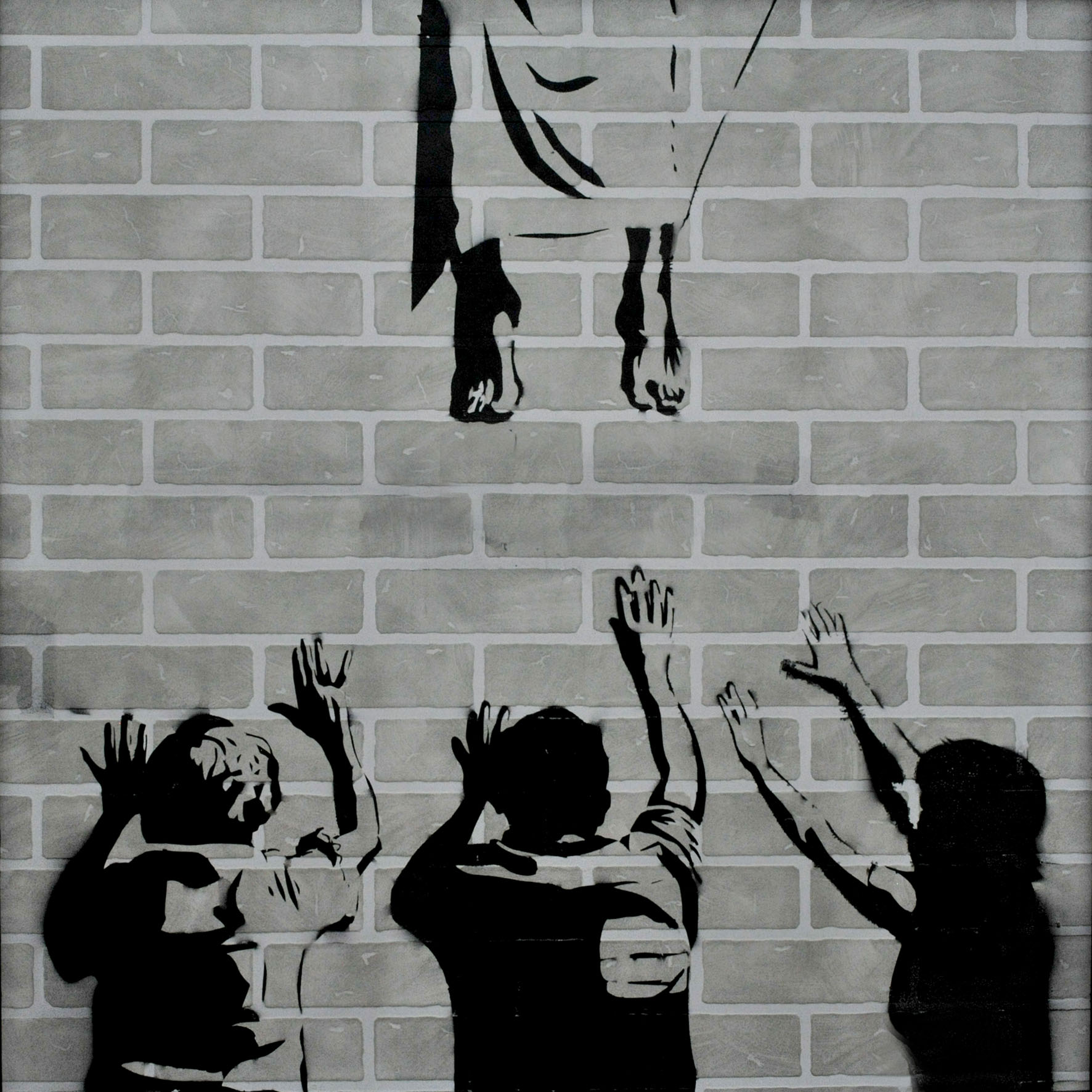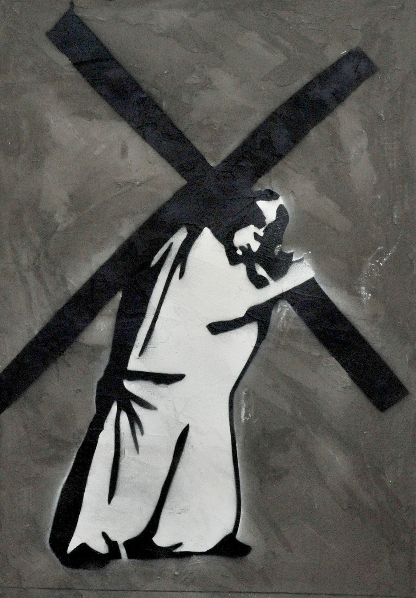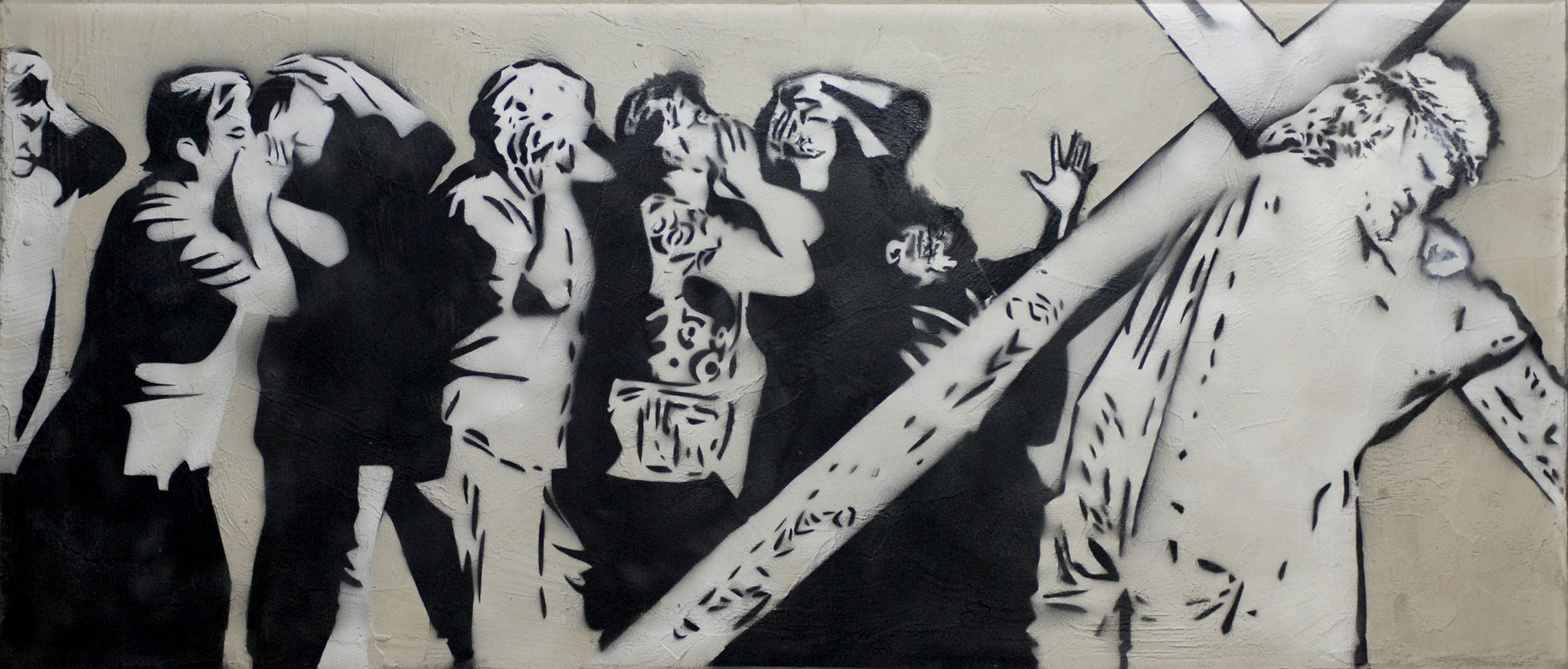 Я думал о том, что это могут воспринять так. Мне нравится, когда в работах есть двойной-тройной смысл, который не всегда однозначно трактуется. Это уже трафаретное граффити. Для меня это была попытка прочтения старого сюжета в новой технике. С другой стороны, это адаптация классического сюжета к современной действительности.