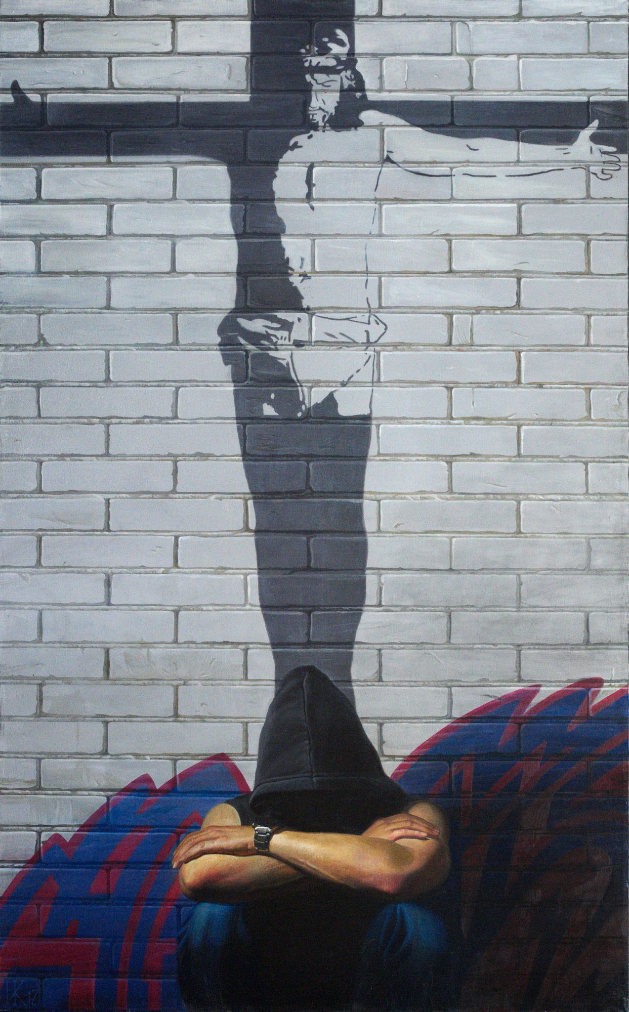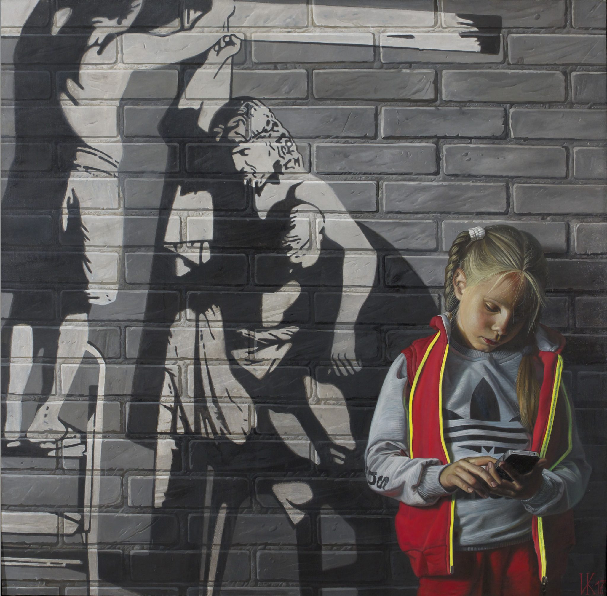 Что касается этой картины, она из всей выставки самая неоднозначная. Помимо кодов, которые считываются сразу (на граффити на стене изображено «Положение во гроб», а молодой человек стоит, смотрит в свой смартфон и слушает музыку). И тут у нас получается двоякий смысл. С одной стороны, молодой человек, который увлечен текущими делами и не видит ничего вокруг. С другой стороны, это может быть «Второе пришествие», которое для всех прошло незамеченным. Его не увидели ни мы, ни он. Иисус увлечен своими делами, мы ему уже не интересны. У него есть смартфон, он устал проливать за нас кровь.