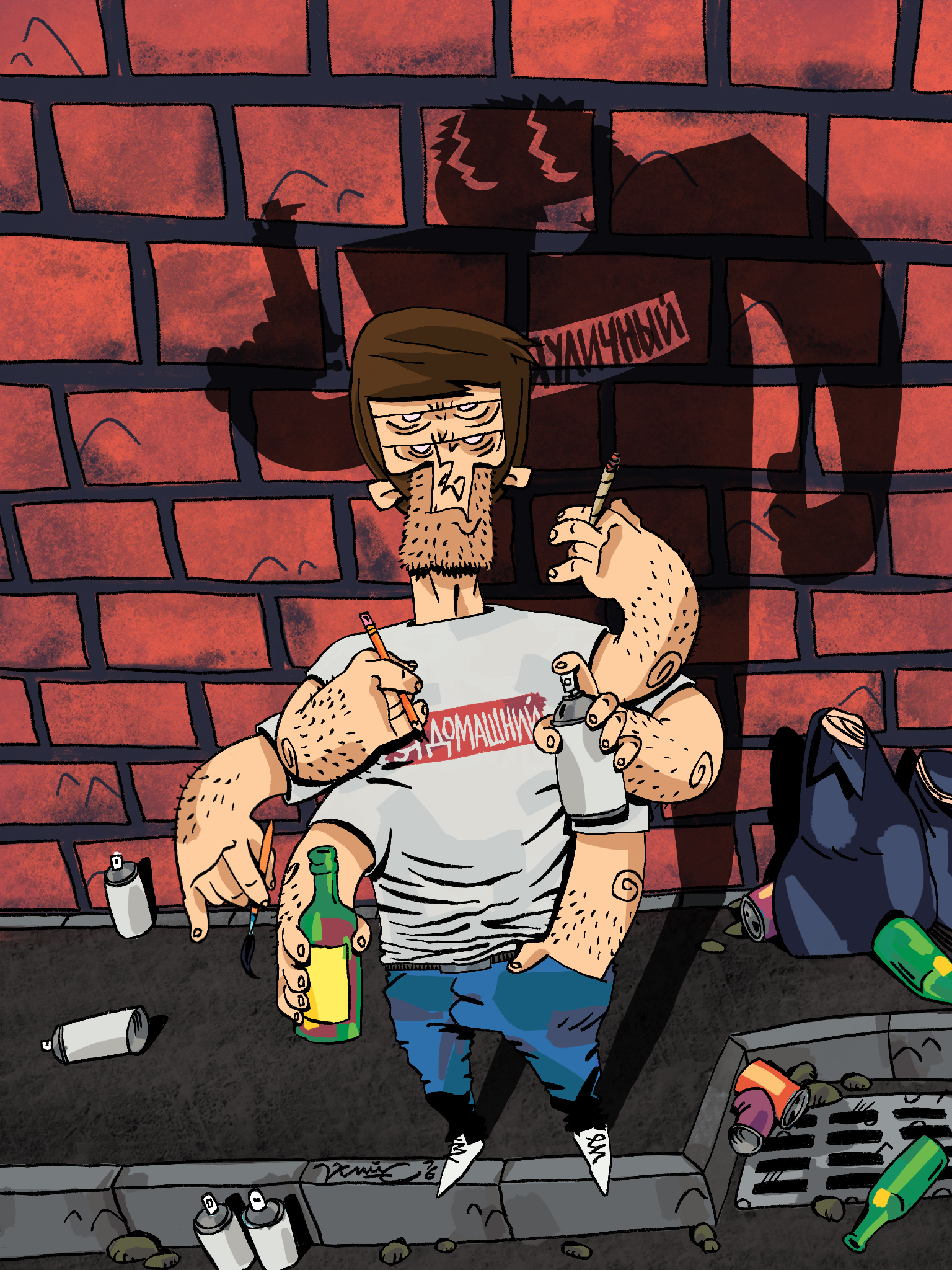 Да, я начинал как классический граффитчик. То есть писал буквы до 2007 года. Хотя помимо этого всё время рисовал какие-то иллюстрации и комиксы дома. И тогда, в 2007, парни, с которыми я часто рисовал, сказали: «Зачем ты пишешь буквы, если рисуешь намного круче? У тебя нет особого стиля в неймрайтинге». И это правда. Я не дизайнер, я художник. Я копировал чужие работы, стили, буквы и жил этим, пока парни не подтолкнули рисовать свое.
