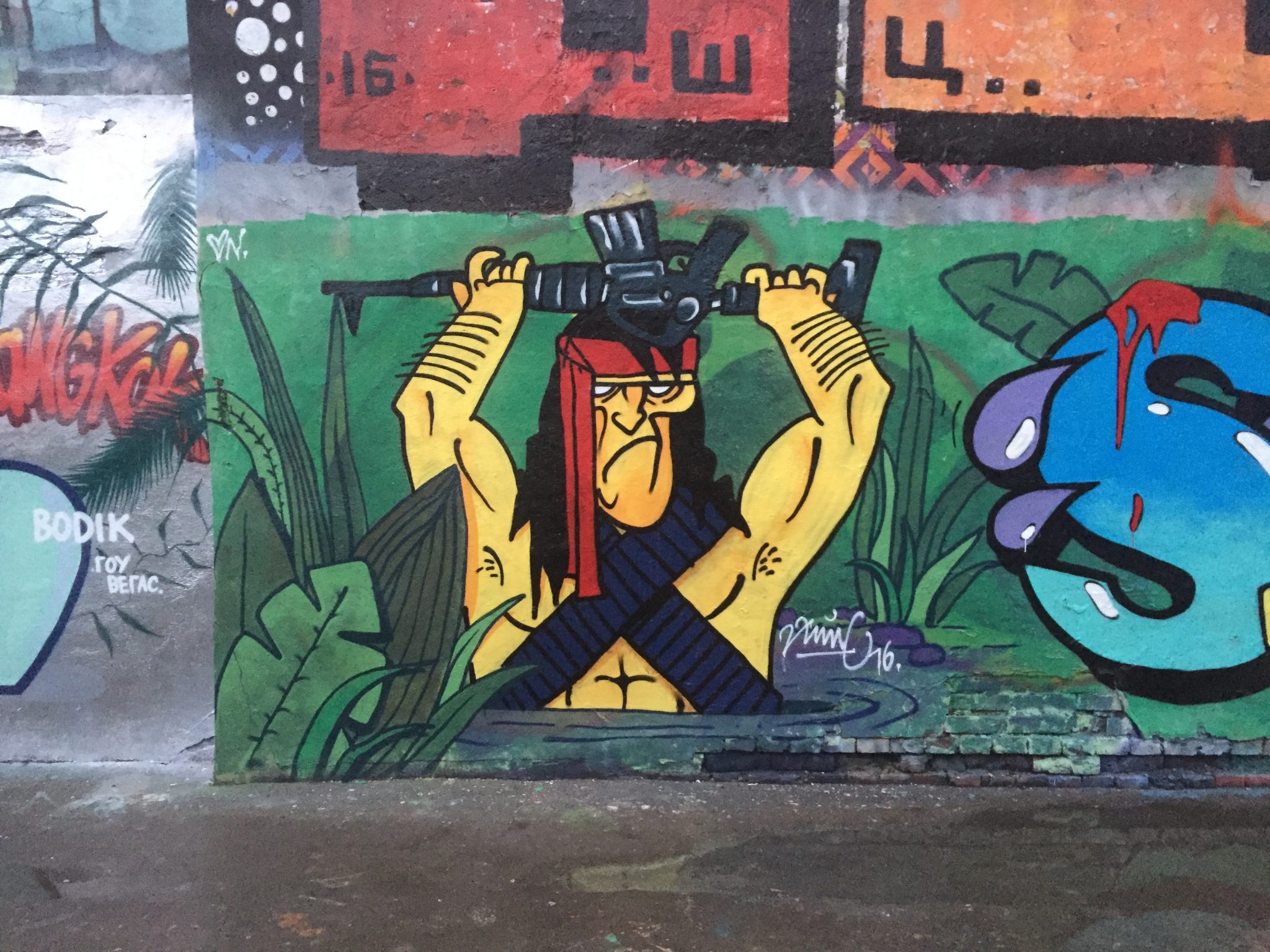 Было одно место, где я попытался нарисовать, но не смог. Это военный бункер в секретном городе в Подмосковье – Чехов-2. Этот бункер сначала был в одном месте, а потом его перенесли на пару километров в соседний лес. А старый затопили, законсервировали. Но патрули все равно ездят. И когда я узнал о существовании такого места и что на его территорию можно попасть, то задался целью сделать рисунок на тех самых воротах, через которые загружали запасы в старый бункер. Приехал, а там слишком много патрулей, у которых команда — стрелять на поражение. Поэтому и не смог.